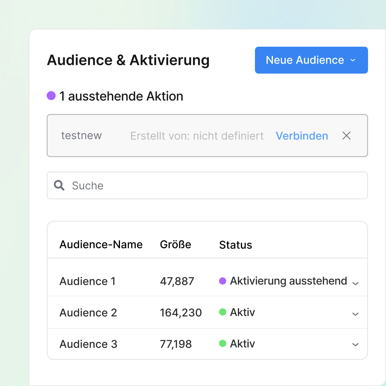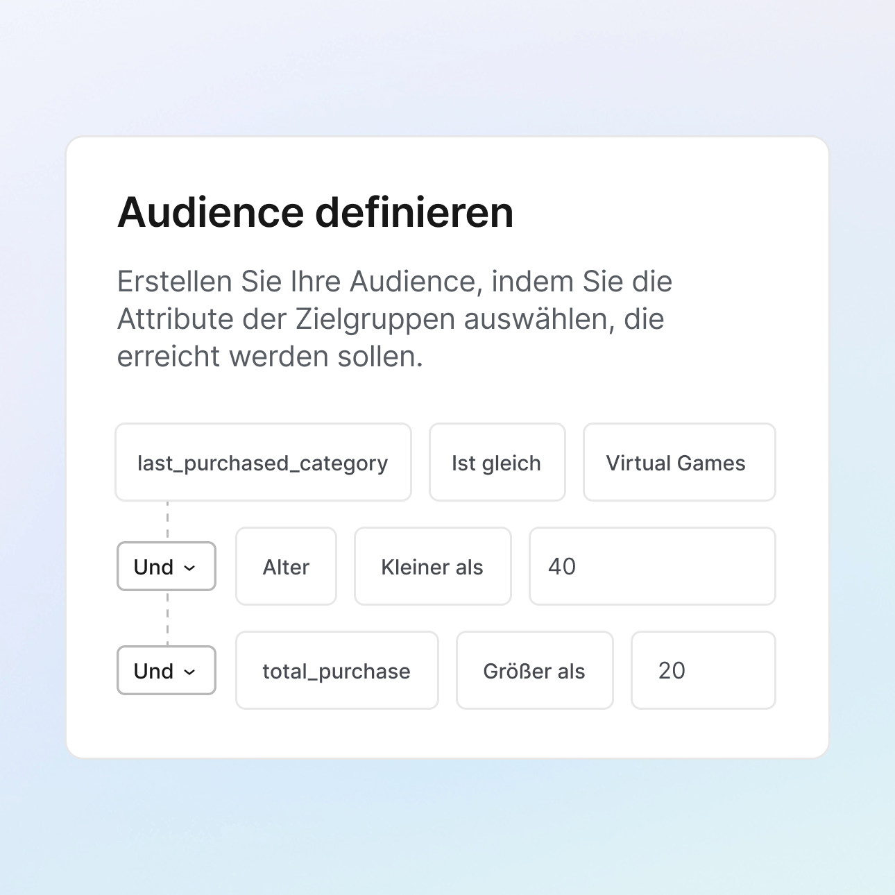 Erstellen Sie leistungsstarke Segmente ohne technisches Fachwissen. Mit unserem visuellen Audience Builder definieren und aktivieren Sie schnell wirkungsvolle Zielgruppen, die Ihre Kampagnen-Performance beschleunigen.