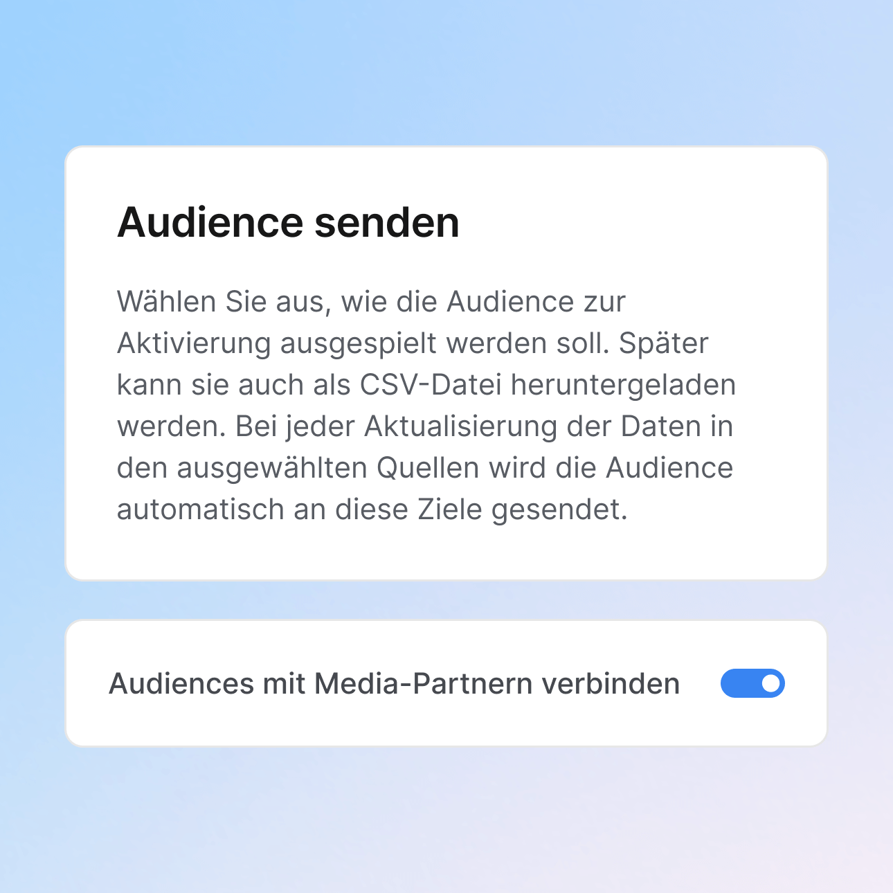 Erreichen Sie potenzielle Kunden über jeden Kanal. Ob über integrierte Partner oder maßgeschneiderte Exporte für Onsite-Kampagnen – erzielen Sie maximale Wirkung, die den vielfältigen Anforderungen von Marken gerecht wird.