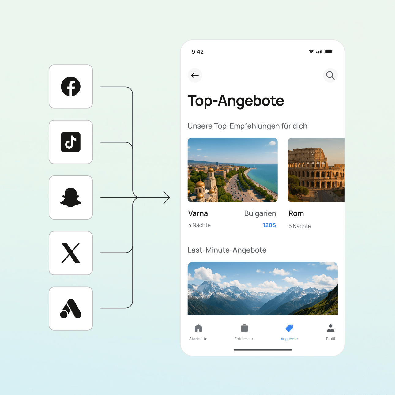 Verwandeln Sie Social Traffic durch nahtloses Deep Linking in loyale App-User. Reparieren Sie fehlerhafte User Journeys, senken Sie Ihre Akquisekosten um 33 % und schaffen Sie direkte Pfade von jeder Social-Plattform zu wertvollen In-App-Erlebnissen.