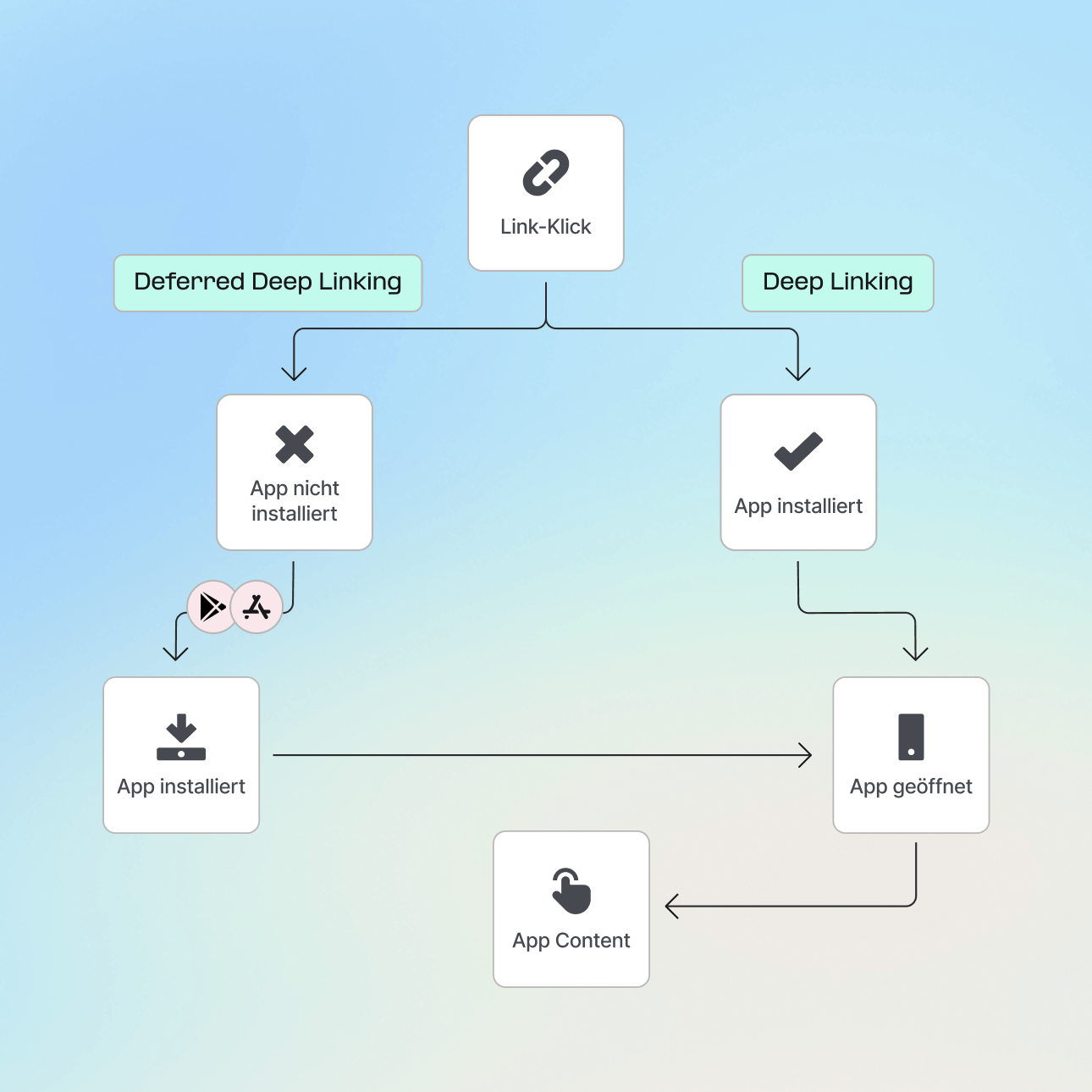 Verwandeln Sie jeden Web-Besuch in eine App-Chance. Erkennen Sie User-Geräte automatisch, um nahtlose Übergänge zu ermöglichen – leiten Sie neue User in die App-Stores oder führen Sie bestehende User per Deep-Linking direkt zu relevanten In-App-Inhalten.