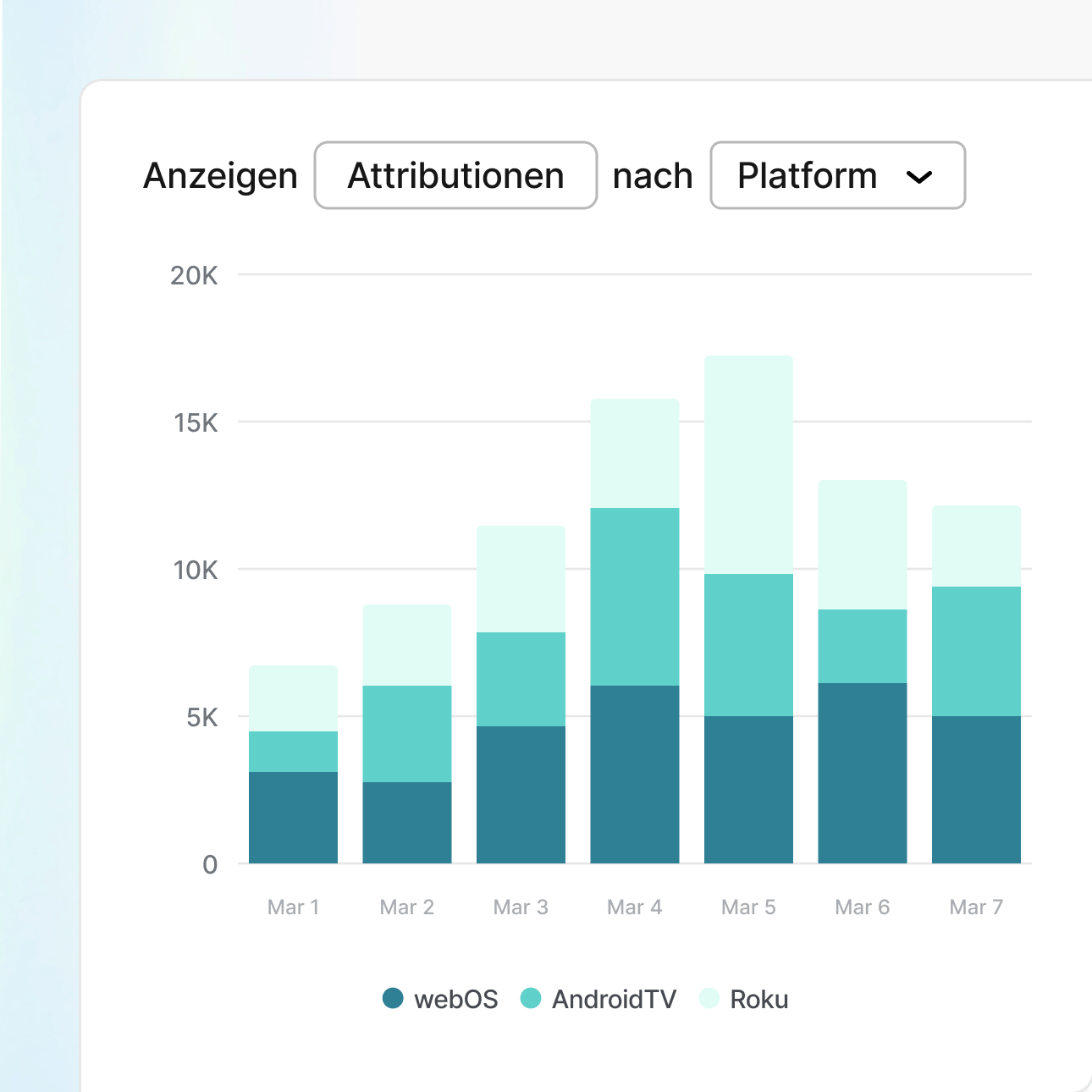 Verknüpfen Sie CTV-Impressions mit tatsächlichen Installationen, ersten Käufen und Abonnement-Upgrades über jedes Device und jede Plattform hinweg. Zeigen Sie Ihrem Management mit klaren Attributionsdaten exakt auf, wie viel Umsatz CTV im Vergleich zu Ihren anderen Kanäle generiert.