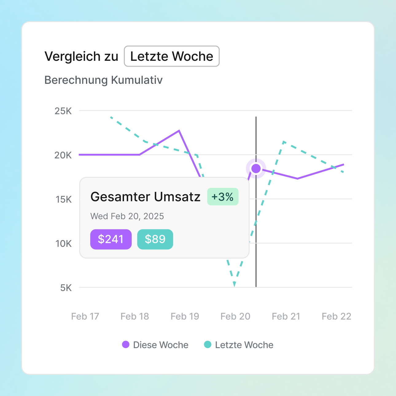 Vergleichen Sie die aktuelle Performance-Daten mit jedem vergangenen Zeitraum. Identifizieren Sie Trends, erkennen Sie Anomalien und beantworten Sie Business-Fragen schneller – mit flexiblen Zeiträumen, die die Entwicklung von Kampagnen über die Zeit sichtbar machen.