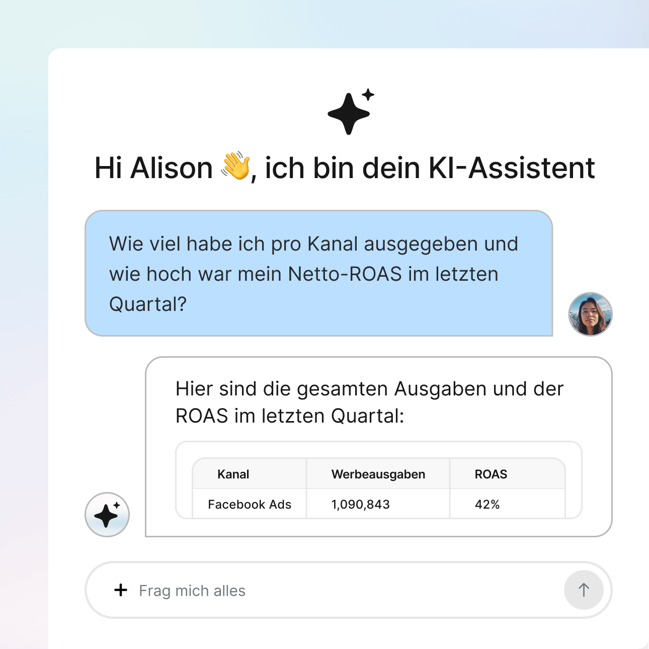 Erhalten Sie sofortige Antworten auf Datenfragen. Komplexe Metriken aufschlüsseln, Setup-Fragen klären oder Zahlen richtig einordnen – einfach fragen und Insights erhalten, die sicheres Handeln ermöglichen.