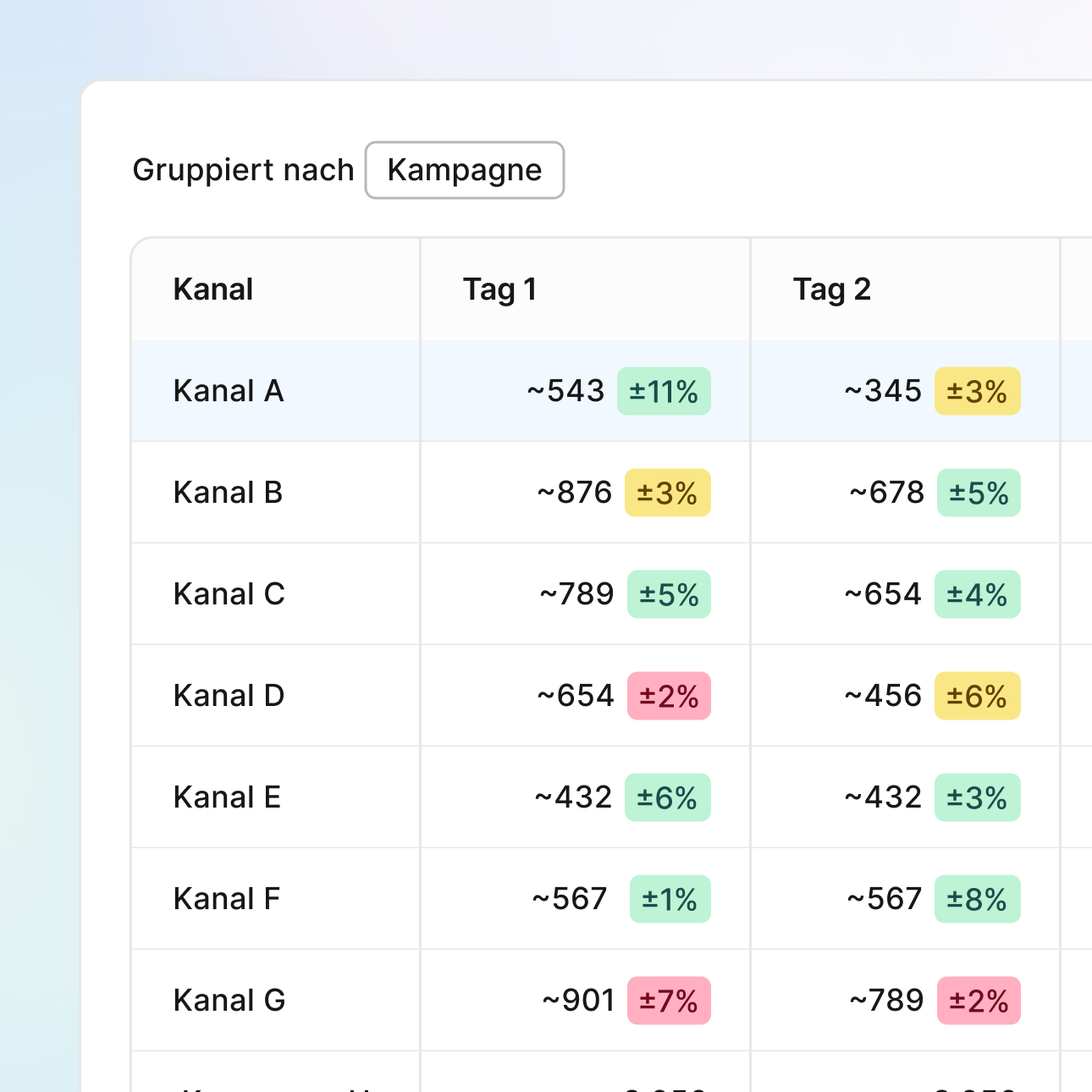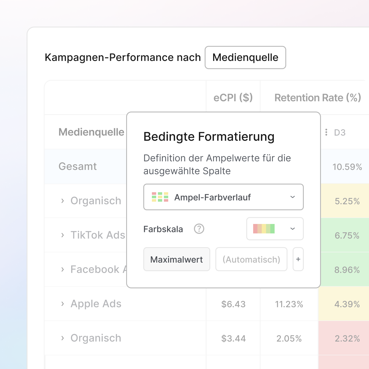 Identifizieren Sie Top- und Low-Performer sofort – mit smarter Visualisierung. Nutzen Sie Farbregeln, Schwellenwerte und metrikspezifische Filter, um das Wesentliche hervorzuheben – ohne endlos Zahlen zu durchsuchen.