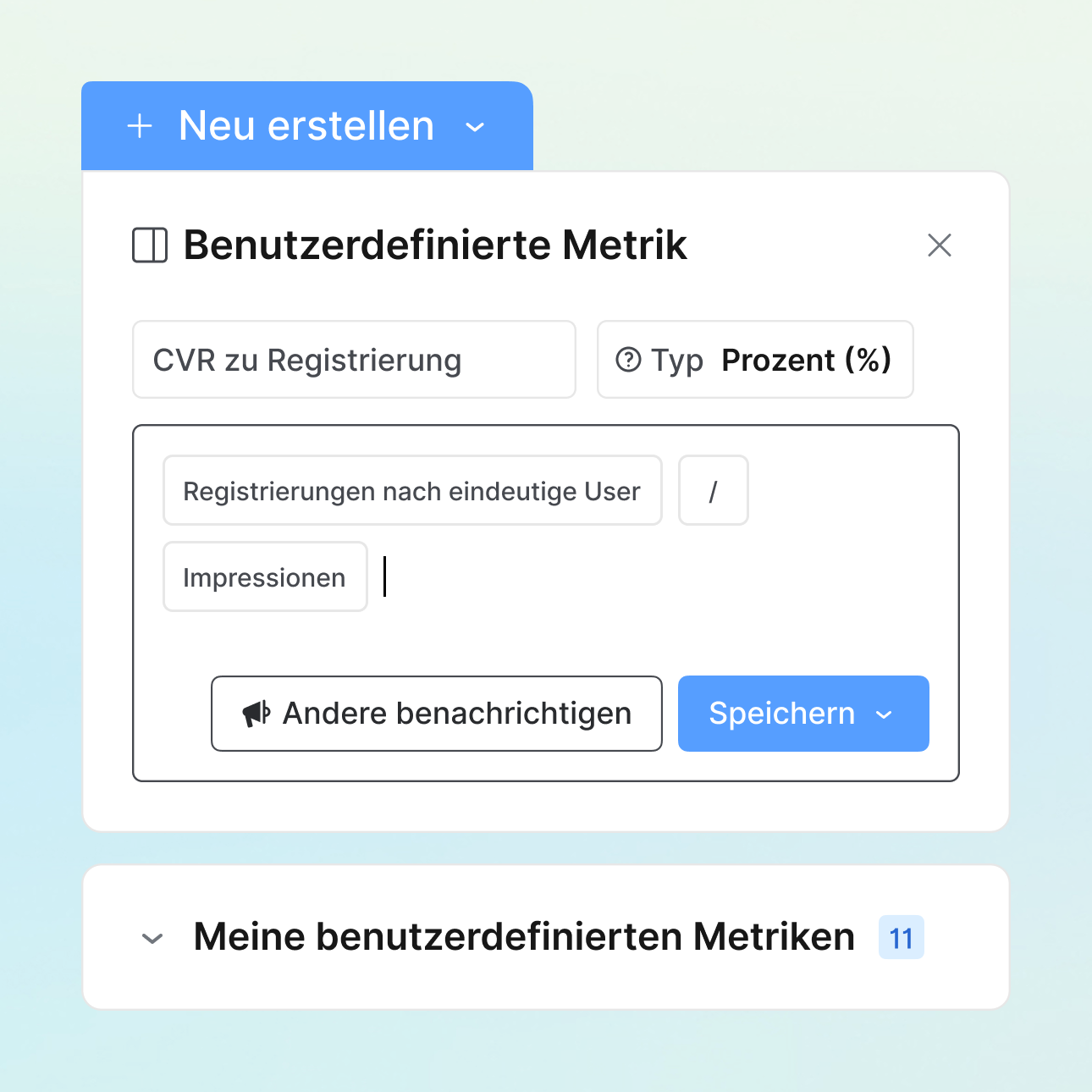 Messen Sie, was für Ihr einzigartiges Unternehmen wichtig ist. Erstellen Sie Metriken, die zu Ihren spezifischen KPIs und Zielen passen, und ermöglichen Sie Teams, auf Basis echter Wirkung statt generischer Benchmarks zu optimieren.