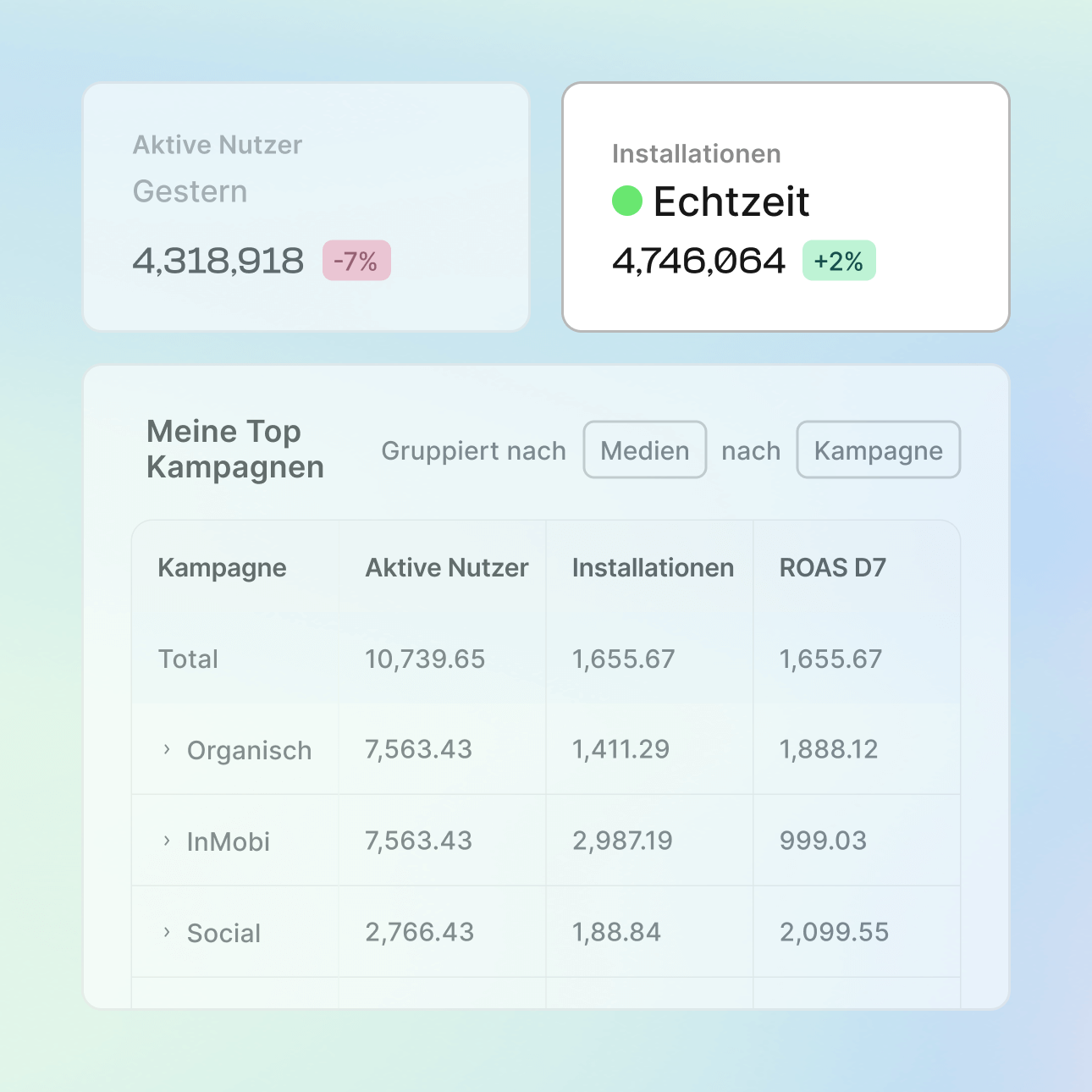 Greifen Sie auf Ihre Kampagnen-Performance in Echtzeit zu. Erhalten Sie sofortigen Einblick in Installationen, Events und Umsätze mit Dashboards, die sich live aktualisieren – für eine unmittelbare Optimierung.