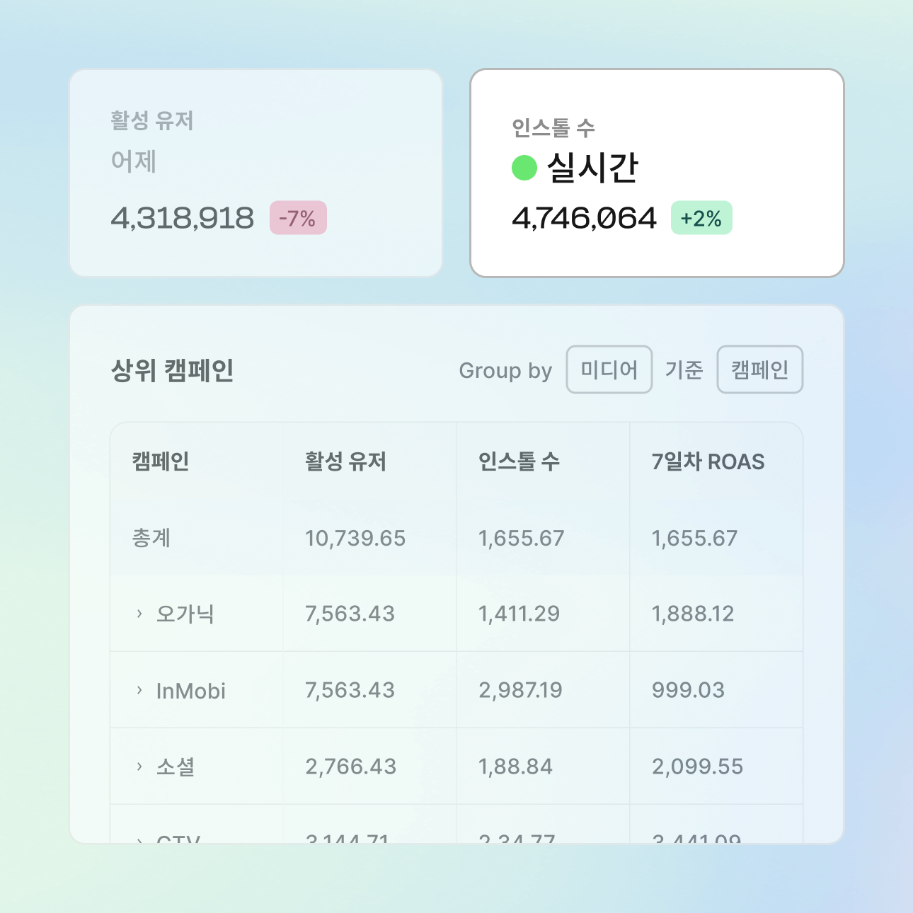 캠페인 성과를 실시간으로 액세스할 수 있습니다. 실시간 업데이트되는 대시보드를 통해 설치, 이벤트, 수익을 즉각 파악하고 빠르게 최적화할 수 있습니다.