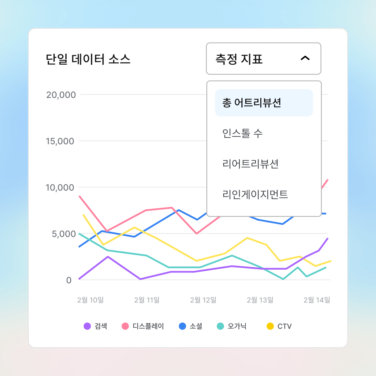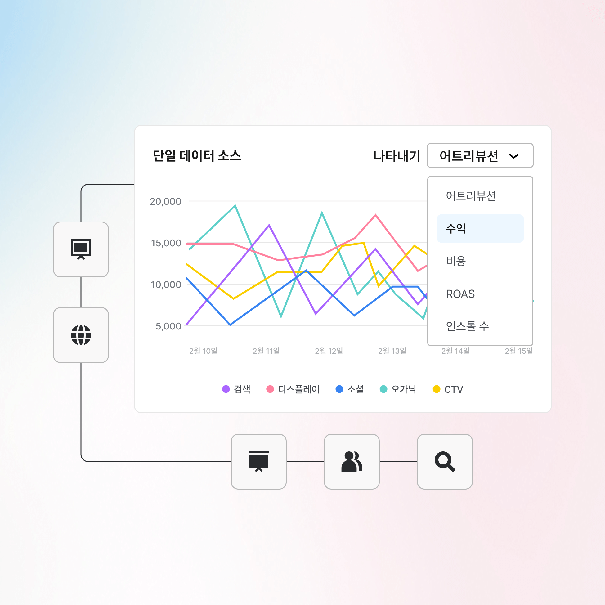 파편화된 데이터 포인트들을 하나의 명확한 성과 스토리로 연결하세요. 어떤 채널이 진정으로 성장을 견인하는지 확인하고, 최적화 기회를 식별하며, 통합된 인사이트를 통해 모든 마케팅 예산이 가치를 발휘하게 만드세요.