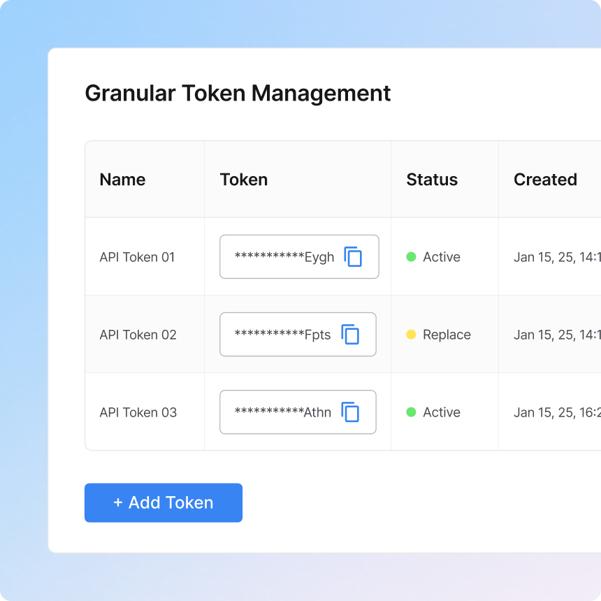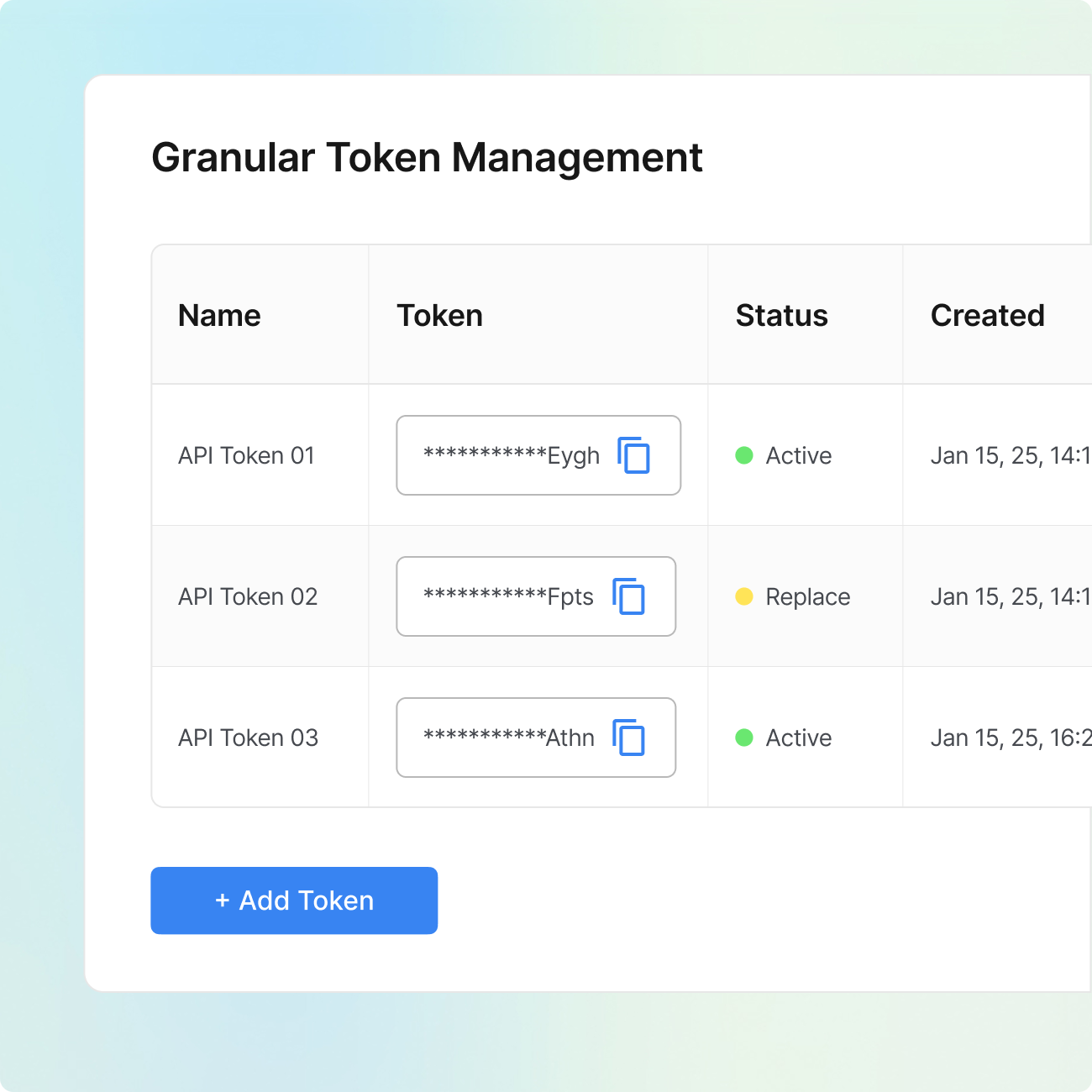 Apply Zero Trust principles with network-level restrictions, up to 50 custom roles, and 30 API tokens. Define permissions precisely and isolate integrations, reducing exposure and protecting sensitive data at scale.