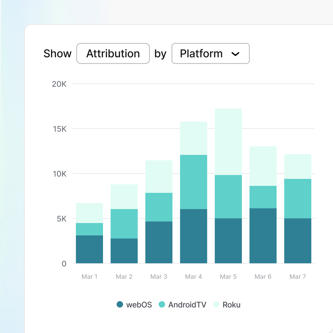 Connect CTV impressions to actual installs, first purchases, and subscription upgrades across every device and platform. Show leadership exactly how much revenue CTV drives versus your other channels with clear attribution data.