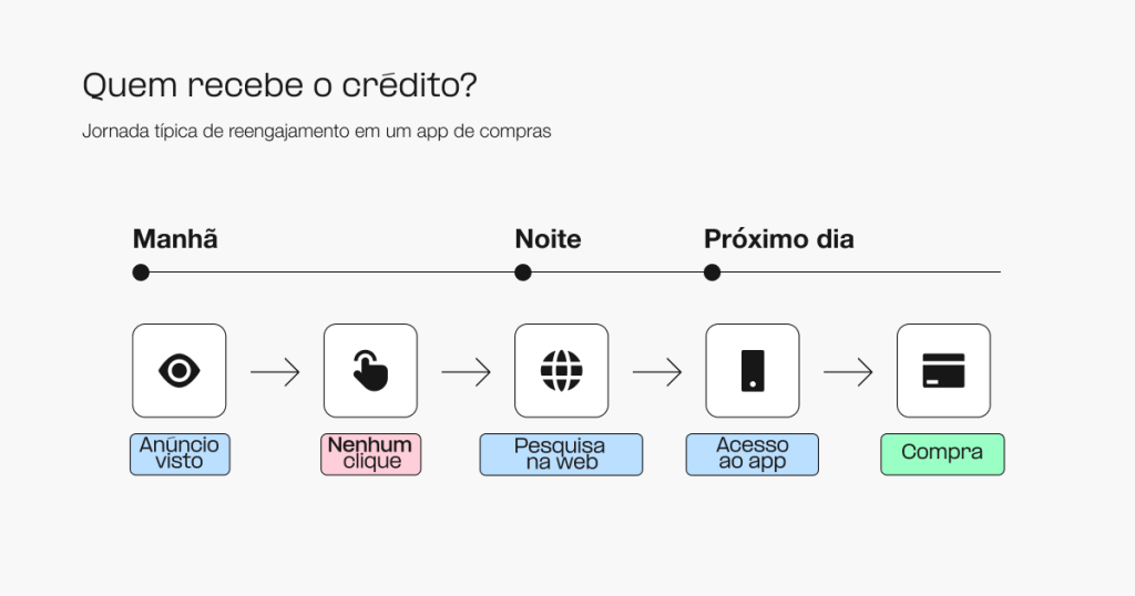 Qual canal recebe crédito? Em uma configuração baseada apenas em cliques, ninguém recebe (parece orgânico) ou o último clique de um touchpoint não relacionado reivindica esse crédito. A impressão e a visita ao site que levaram o cliente de volta ao aplicativo são invisíveis.