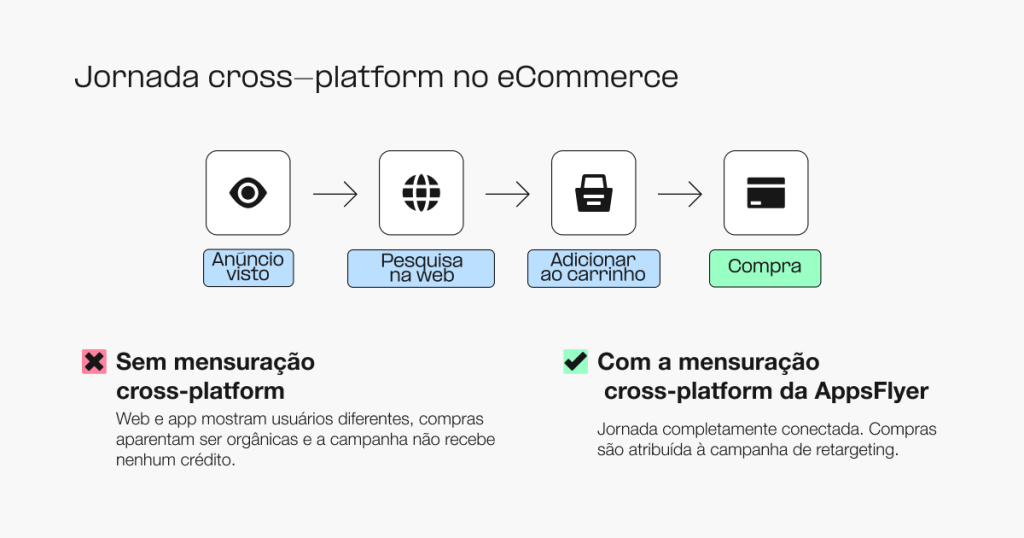 eCommerce: Um cliente clica em um anúncio de remarketing na web mobile, navega por algumas páginas de produtos, mas não compra nada. Duas horas depois, ele abre o aplicativo e realiza uma compra. Hoje, a sessão da web e a compra no aplicativo parecem dois eventos não relacionados. A campanha de remarketing que iniciou a jornada não recebe crédito. Com a mensuração cross-platform, os dois touchpoints estão conectados, e o caminho completo torna-se visível.