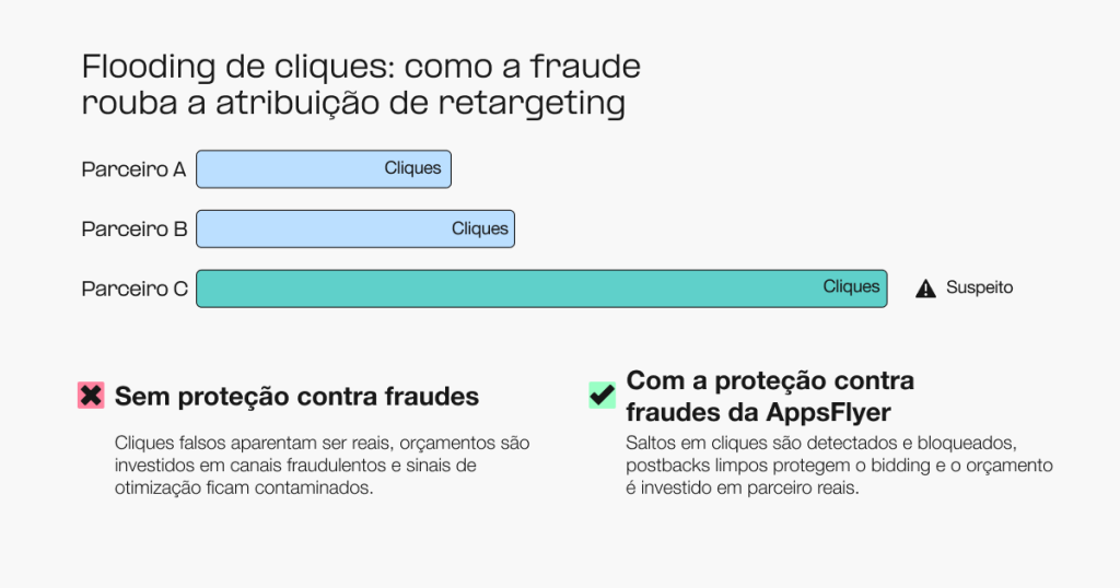 Como isso se parece na prática: Digamos que você esteja executando campanhas de remarketing para um aplicativo de compras em vários parceiros. Os números de um parceiro parecem ótimos no papel: alto volume de cliques e sólidas conversões atribuídas. Porém, uma análise mais detalhada revela que muitos desses cliques chegaram em picos repentinos, com milissegundos de diferença e padrões estranhamente uniformes.