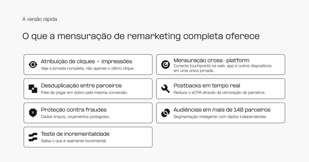 A parte mais complexa? Seus dashboards ainda parecem bons. O ROAS parece normal. Mas a eficiência real dos seus gastos está diminuindo sem que você perceba. Se olhar de relance, você notará que todos esses problemas estão ligados à mesma fonte: sinais fragmentados. Quando impressões, cliques, dispositivos e parceiros operam em silos, ocorrem falhas na atribuição. Para corrigir o remarketing, primeiro é necessário consertar a camada de mensuração que está abaixo dele.