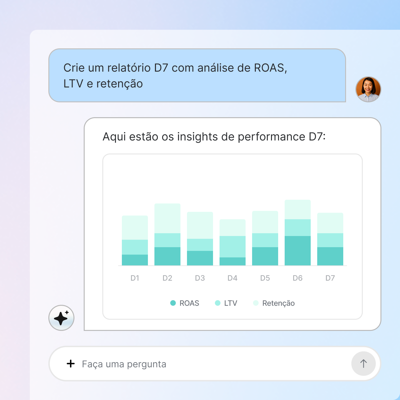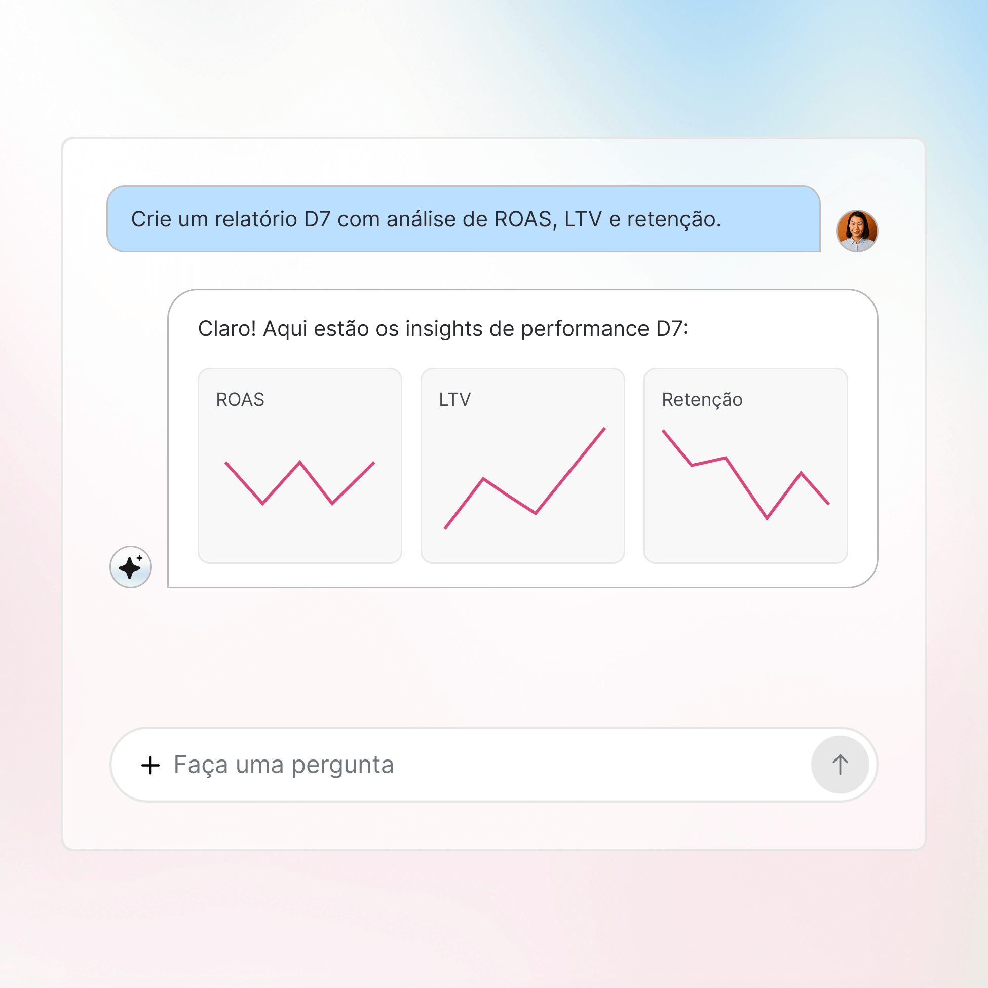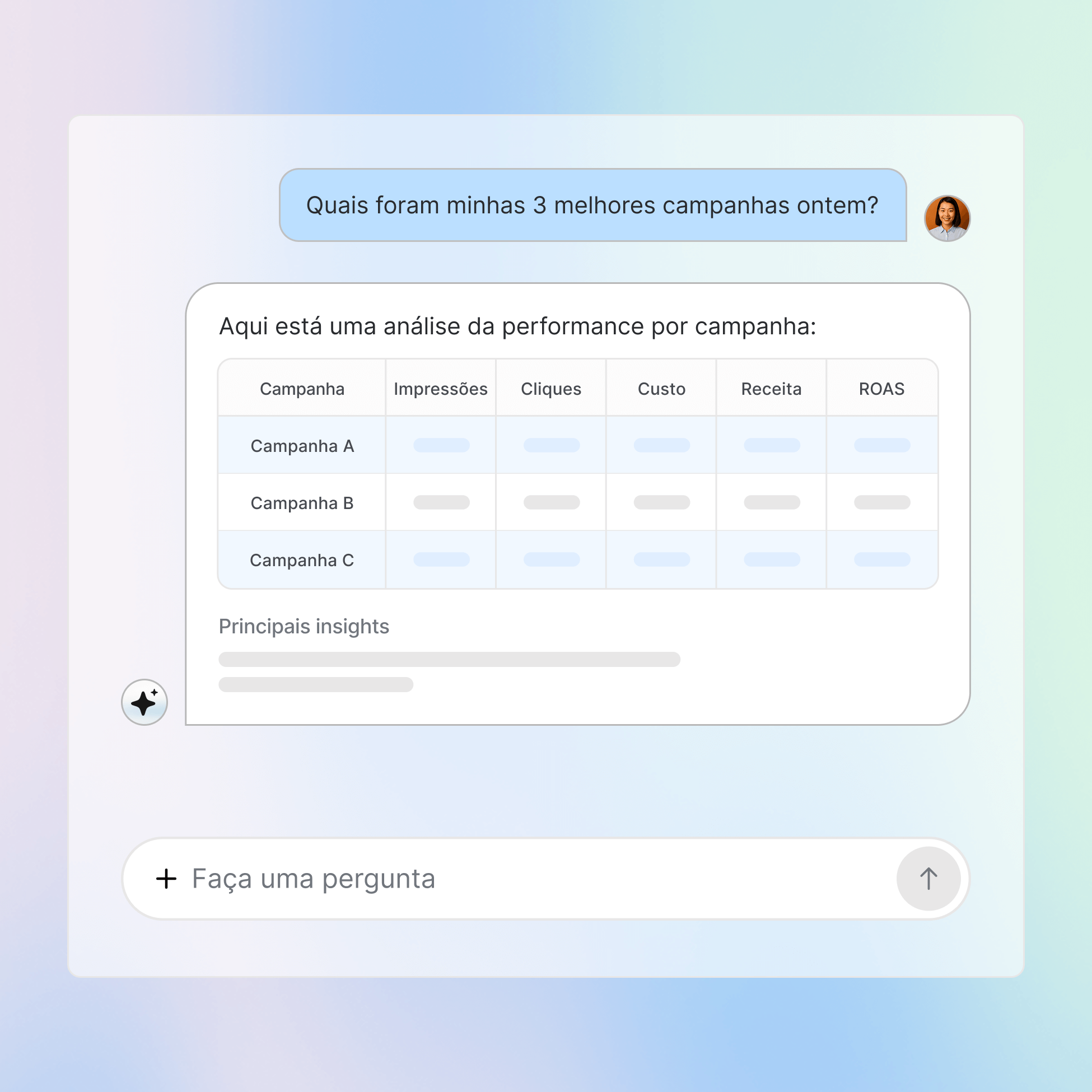 Consulte instantaneamente a performance das suas campanhas, tendências de gastos e métricas de ROI. Receba análises que te ajudam a identificar oportunidades e corrigir problemas sem depender de relatórios estáticos ou da ajuda de analistas.
