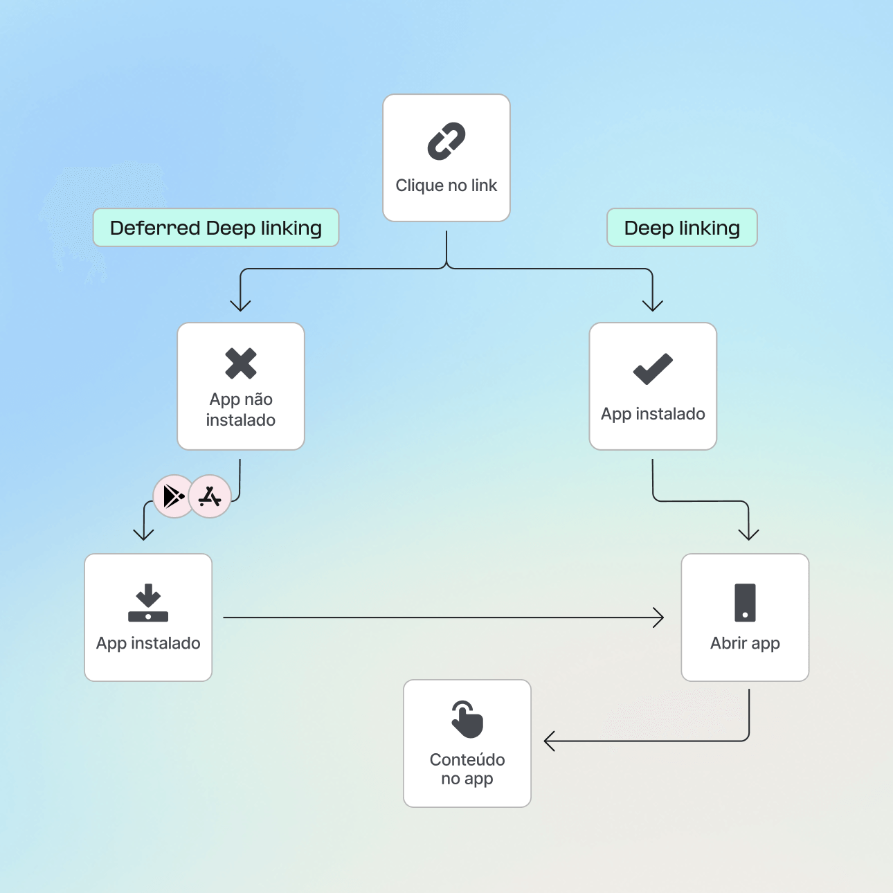 Guie os usuários mesmo se eles não tiverem seu app instalado. Novos usuários passam pela instalação da loja de aplicativos e vão diretamente para o conteúdo pretendido, enquanto usuários existentes já são direcionados para as páginas relevantes.