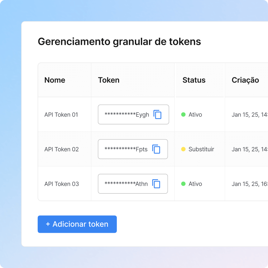 Aplique princípios de Confirança Zero com restrições em nível de rede, até 50 funções personalizadas e 30 tokens de API. Defina permissões com precisão e isole integrações, reduzindo a exposição e protegendo dados sigilosos em grande escala.