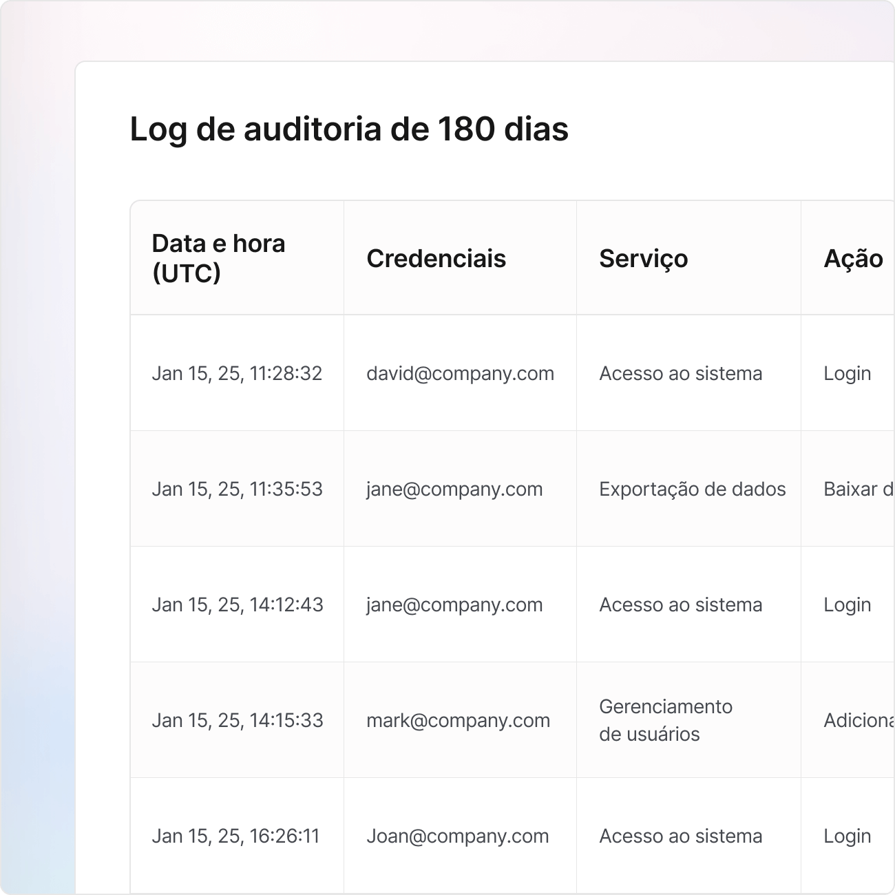 Comprove a compliance com logs de auditoria mais longos, integração SIEM e total visibilidade de acesso. Ofereça suporte a auditorias de SOC2, ISO 27001 e GDPR com relatórios instantâneos e rastreáveis que garantem que a sua empresa esteja sempre preparada.