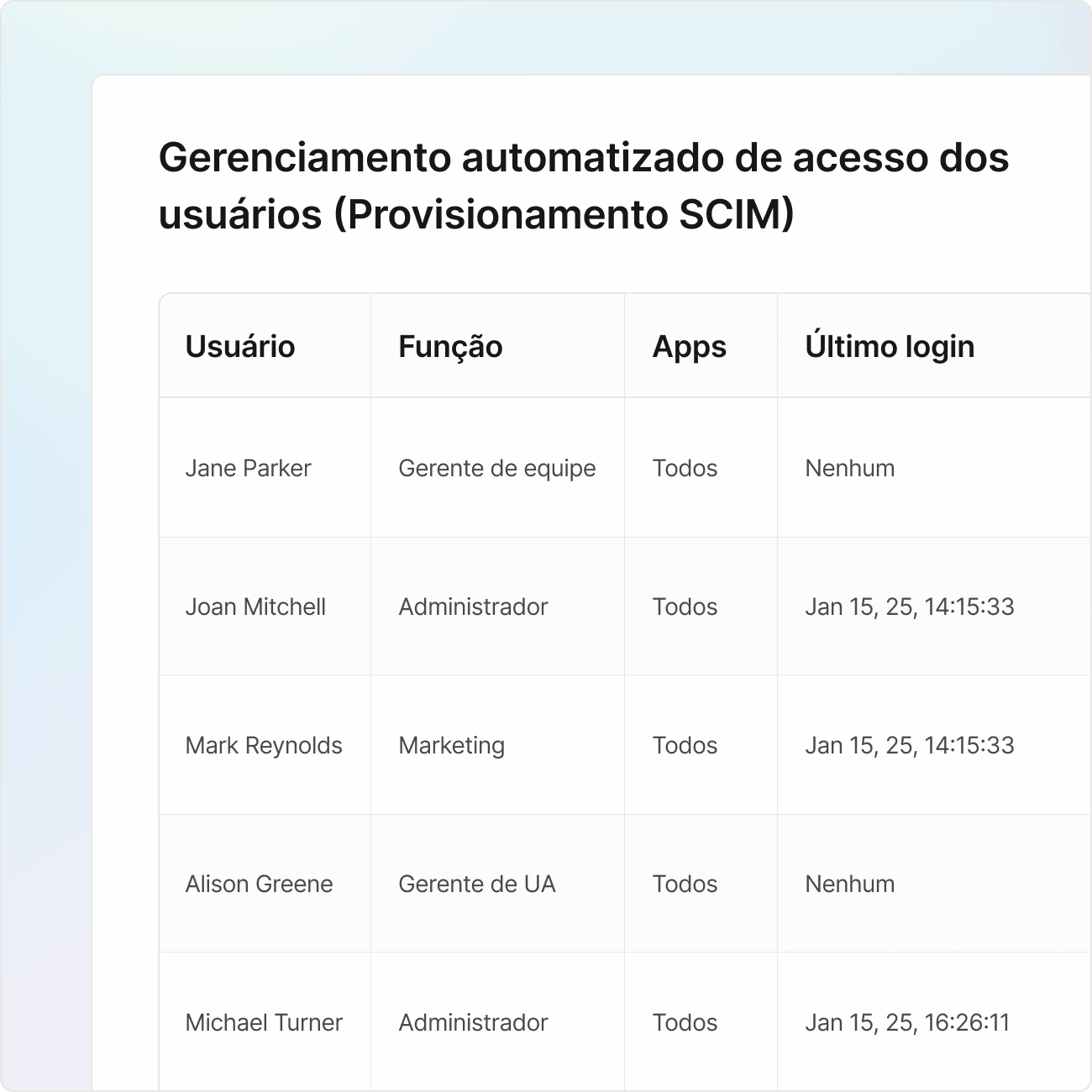 Evite erros humanos e economize tempo de administração com o provisionamento SCIM. Sincronize funções diretamente com seu provedor de identidade para onboarding e offboarding instantâneos, impondo políticas de menor privilégio à medida que suas equipes crescem.