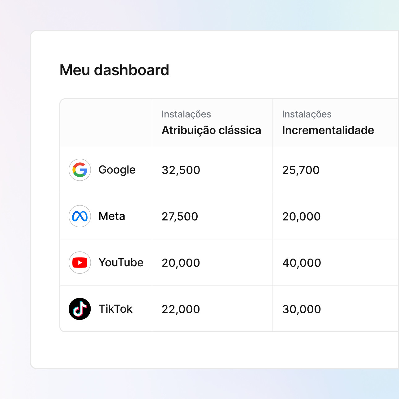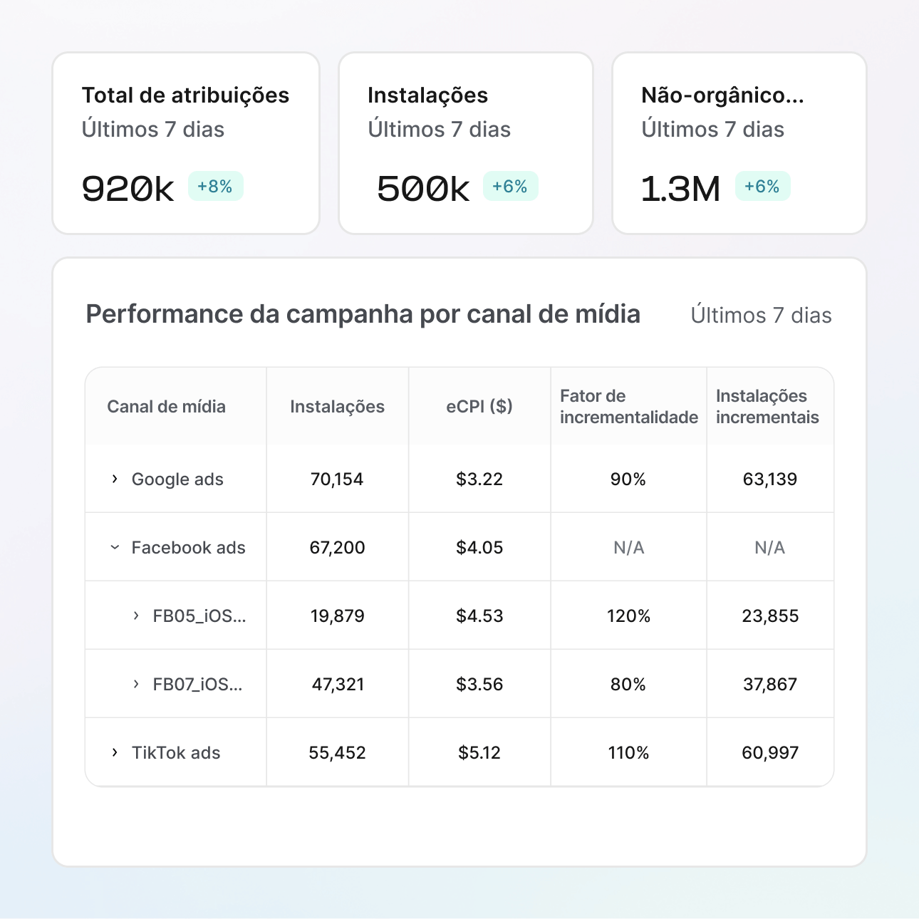 Execute experimentos de incrementalidade nas suas principais ad networks, tudo a partir de um único dashboard. Compare resultados lado a lado, identifique estratégias por canal e redistribua o seu orçamento de acordo com o seu crescimento.