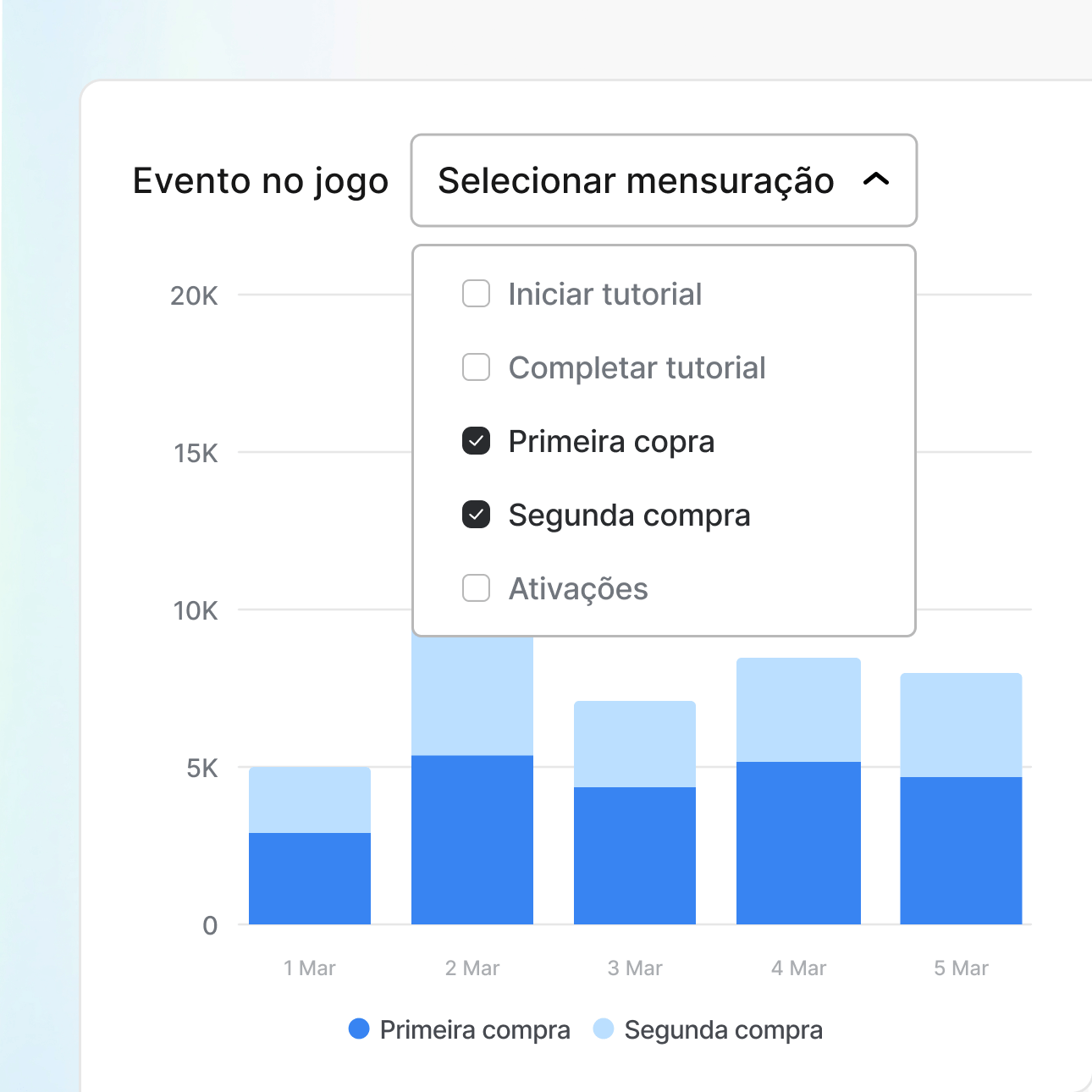 Vá além das instalações para mensurar o que realmente importa. Atribua conclusões de tutoriais, primeiras compras, ativações e eventos personalizados em todas as plataformas de gaming com a mesma precisão das jornadas mobile.