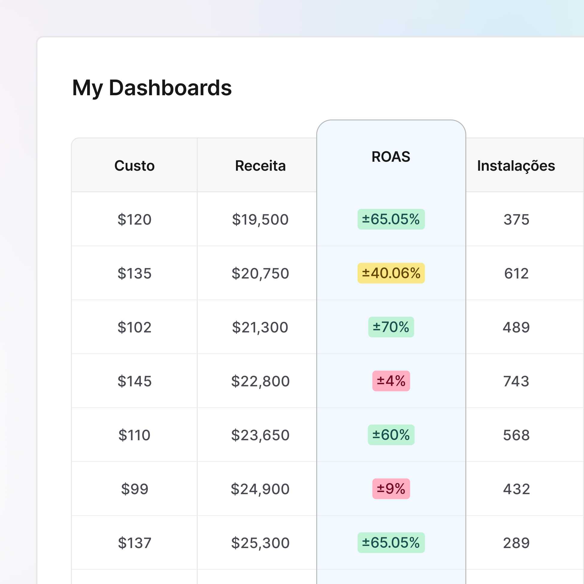 Centralize dados de custo de mais de 100 ad networks e parceiros. Receba métricas precisas, granulares e atualizadas em tempo real, além de acessar um histórico de dados completo para otimizar estratégias.