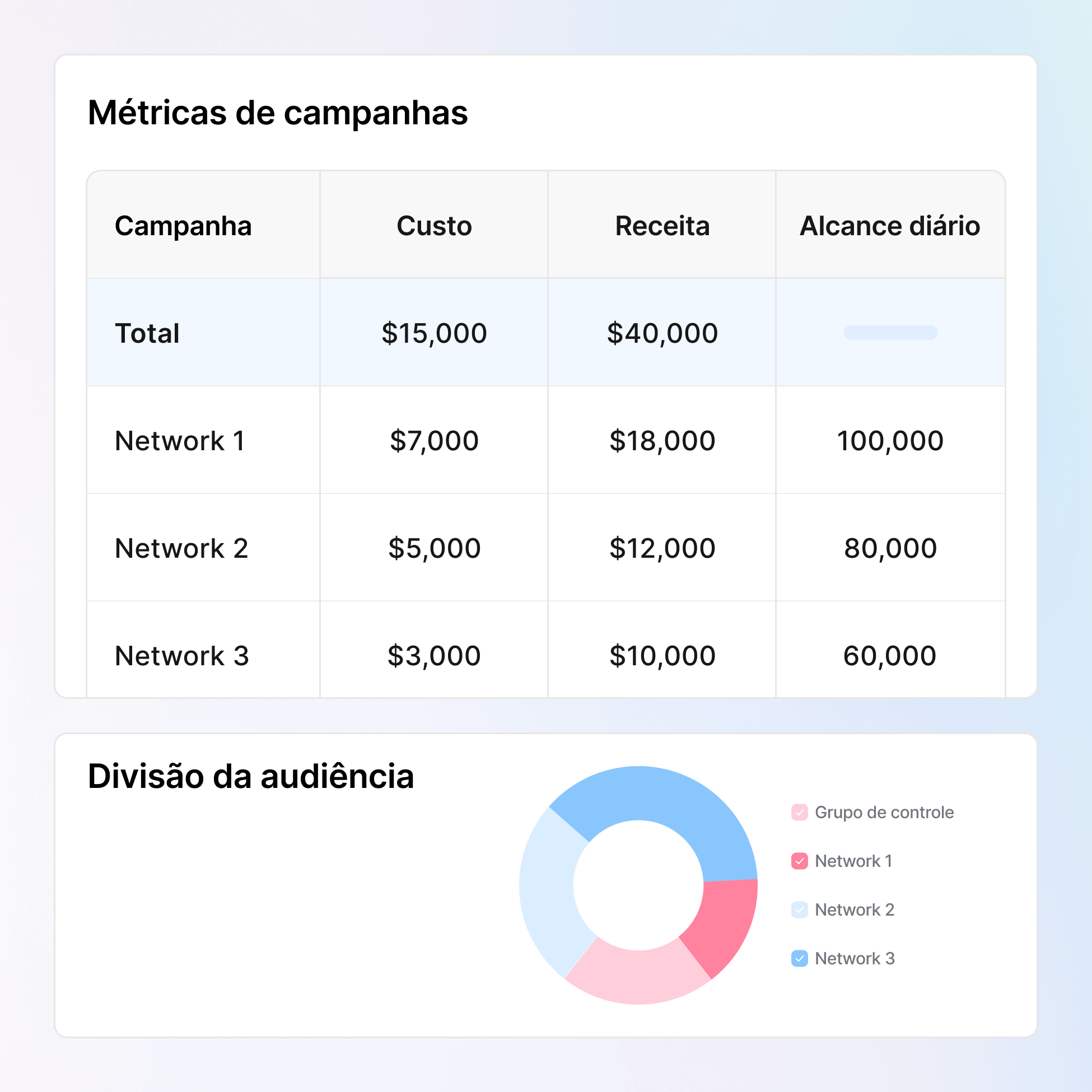 Crie segmentos de audiências em minutos e ative-os no Meta, Google e TikTok. Fortaleça marcas parceiras através de ferramentas autônomas que aceleram o lançamento de campanhas sem que você perca o controle dos seus dados first-party.