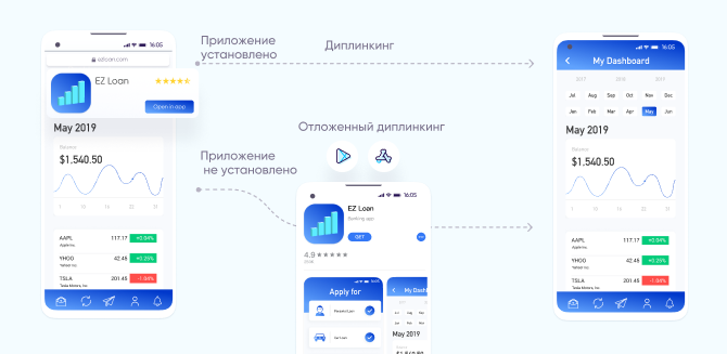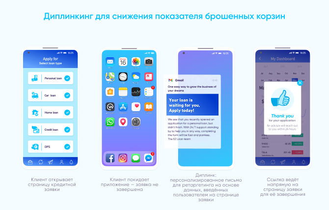 Используя диплинки, размещённые в этих баннерах, маркетологи могут привести новых пользователей к установке банковского приложения, затем бесшовно направить их на ту же страницу продукта или услуги, которую они просматривали ранее, а позднее – на страницу формы для регистрации.