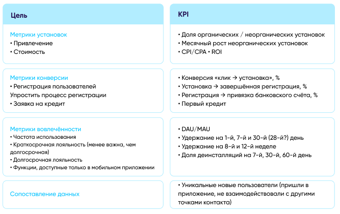 На диаграмме ниже описаны основные метрики, которые банки могут использовать для оптимизации своих усилий и привлечения пользователей с наибольшей ценностью для своих приложений. В левой колонке – цели, характерные для данной вертикали, а в правой – метрики, посредством которых эти цели могут быть достигнуты.
