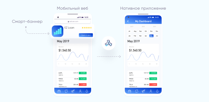 Маркетологи банковских приложений также могут использовать диплинкинг, чтобы переводить существующих и конвертирующихся пользователей с мобильной веб-версии прямо в приложение через смарт-баннер с призывом «Открыть в приложении».