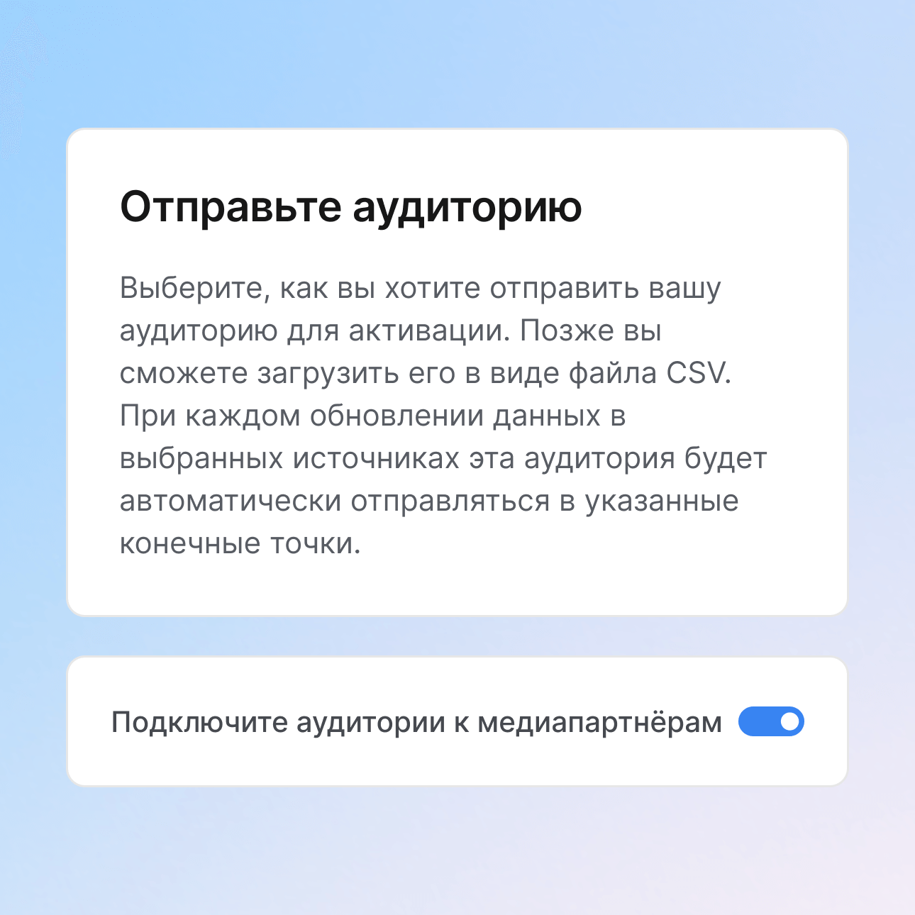 Направляйте аудитории к более чем 100 интегрированным партнёрам мгновенно. От соцсетей до DSP-платформ и персонализации на сайте – активируйте сегменты везде, где вашим брендам нужно взаимодействовать с клиентами.