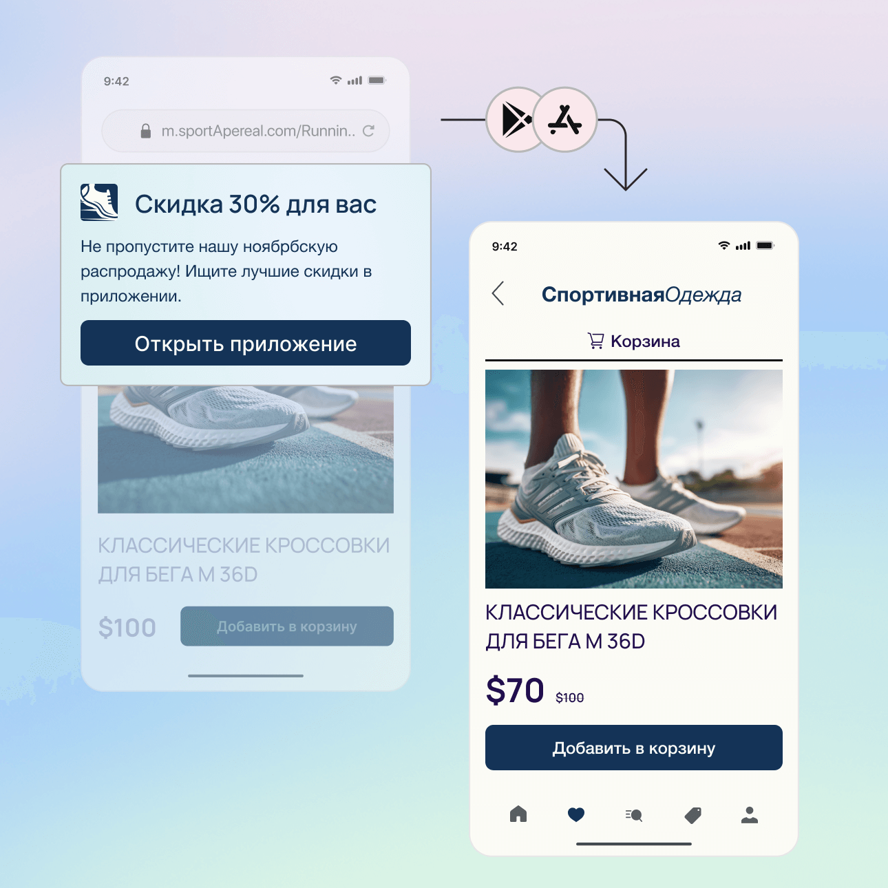 Отложенный диплинкинг позволяет всегда сохранять контекст кампании – от первой установки до повторного вовлечения. Настраивайте любую платную или собственную медиакампанию так, чтобы пользователи могли переходить сразу к нужному экрану в приложении, стимулируя таким образом клиентов совершать необходимые действия и обеспечивая свой ROI.