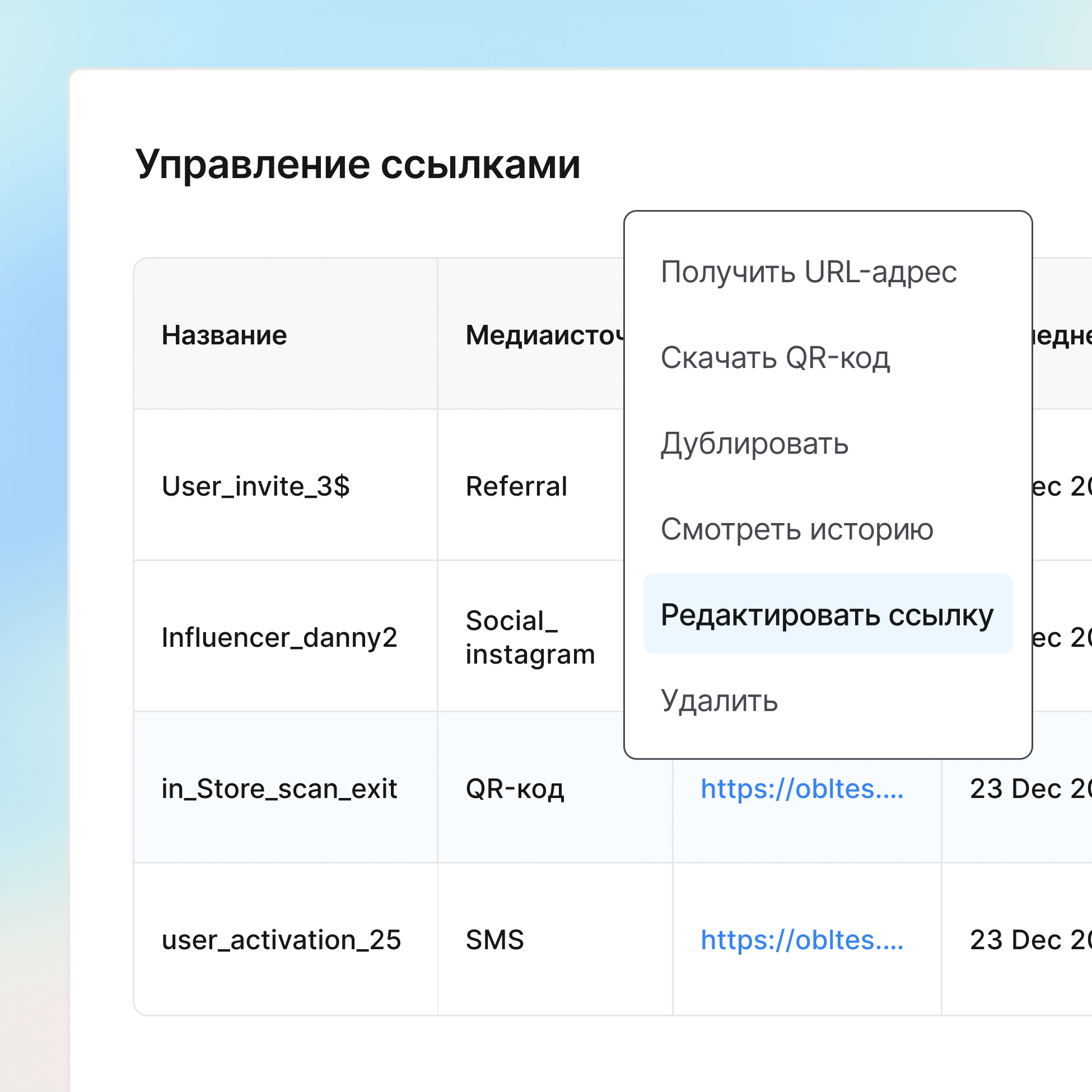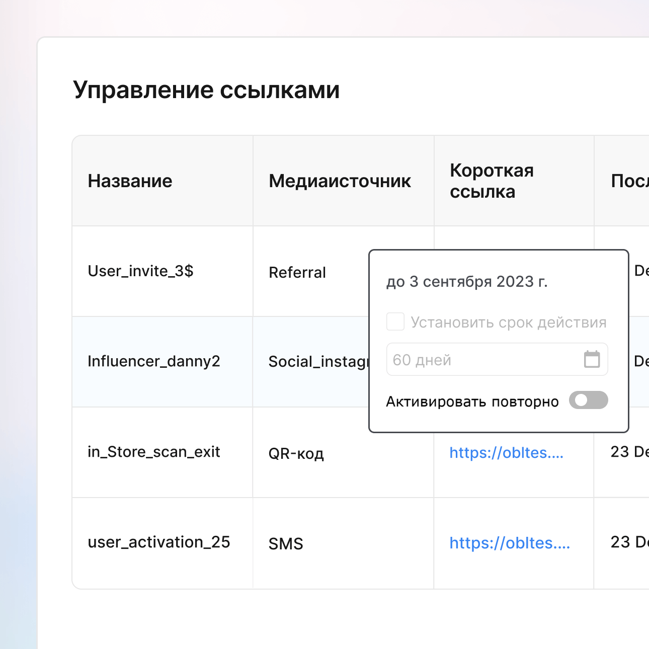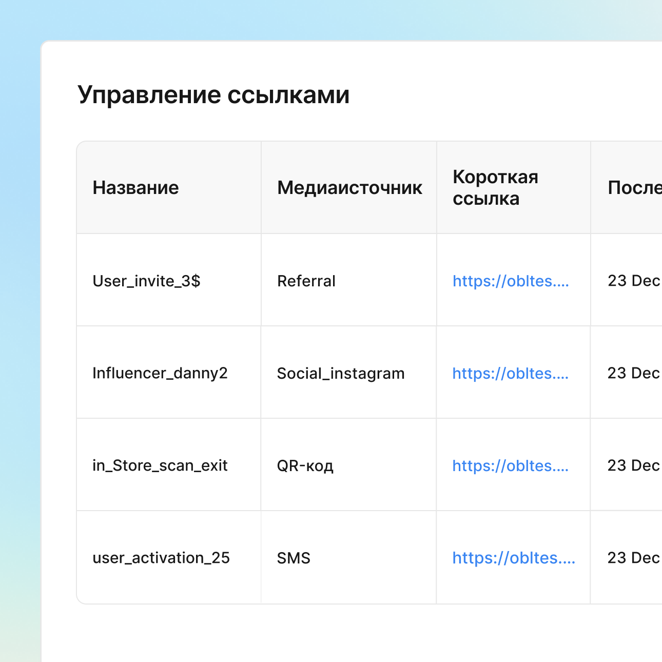 Управляйте всем жизненным циклом ссылок с одного дэшборда. Устанавливайте даты окончания действия, мгновенно приостанавливайте кампании, вносите правки, не меняя уже существующие ссылки. Полная прозрачность: вы можете видеть все активные ссылки, есть ли какие-то проблемы или всё работает как надо – всё в одном месте.