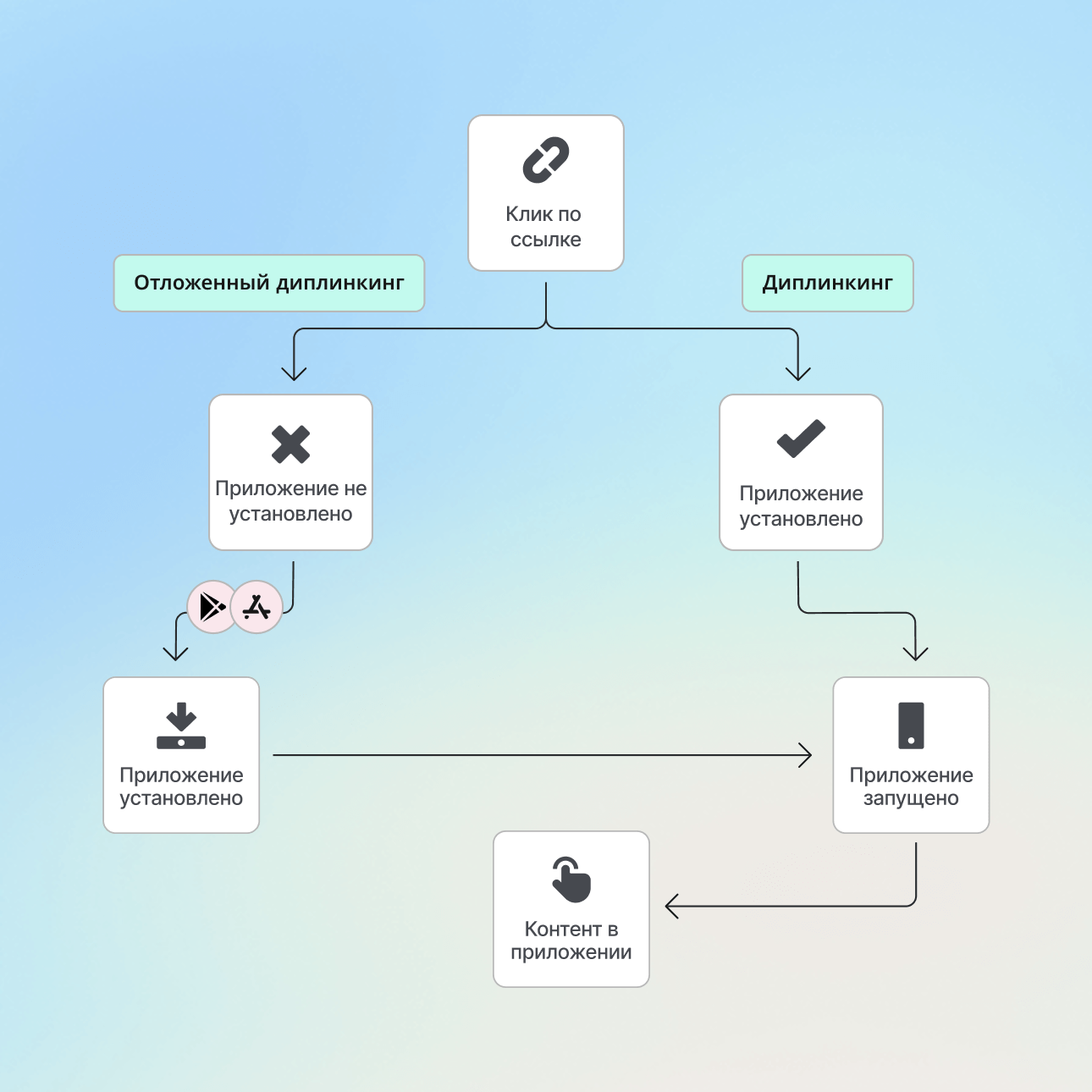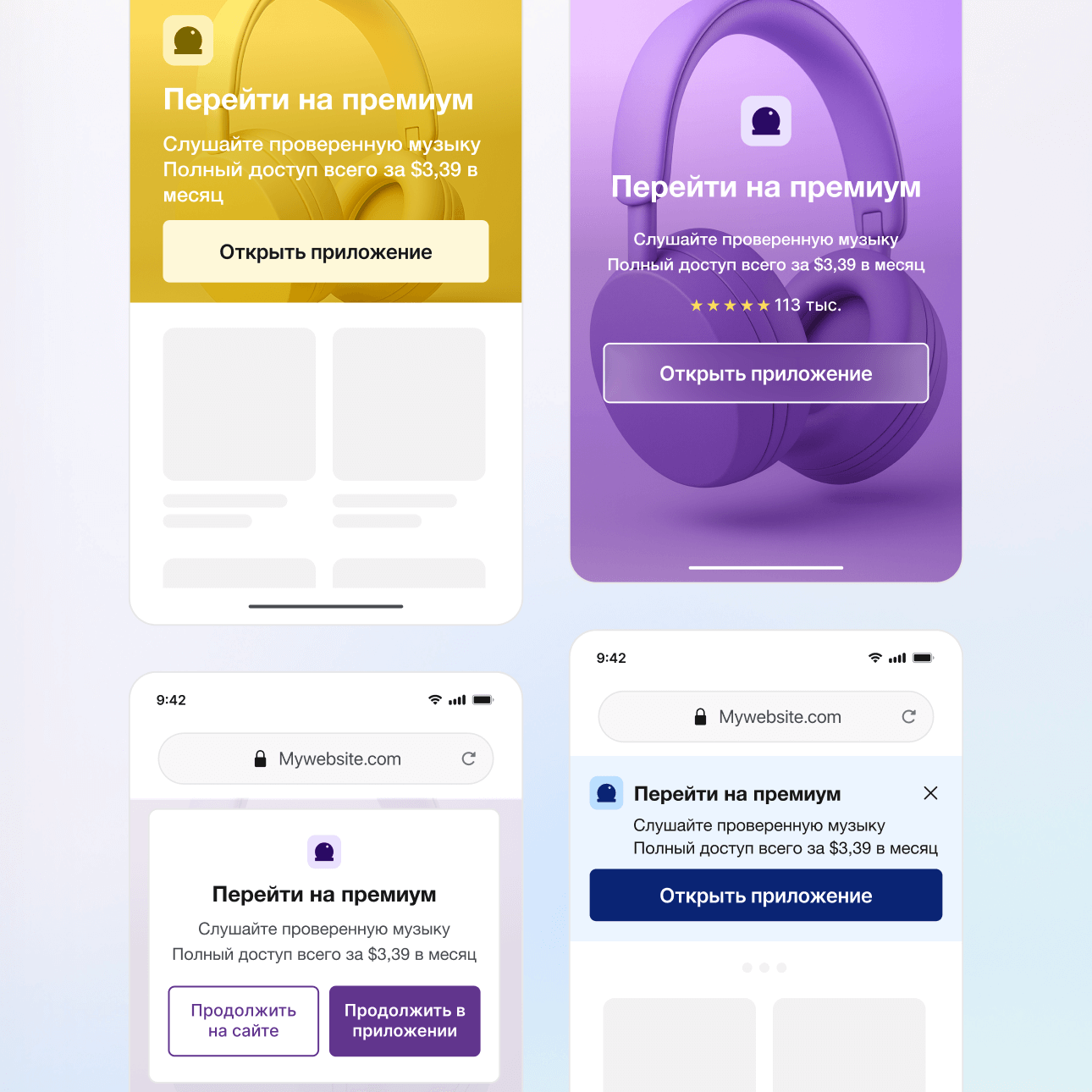 Превратите каждый визит на сайт в возможность для приложения. Автоматически определяйте устройства пользователей, чтобы обеспечить плавный переход: направляя новых пользователей в магазины приложений, а действующих – через диплинк прямо к релевантному контенту внутри приложения.
