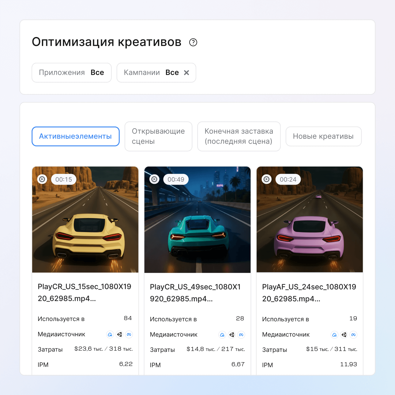 Автоматически выявляйте лучшие креативы во всех каналах и размещениях. См., какие видео, изображения и тексты приводят к реальным конверсиям, затем масштабируйте лучшие варианты и заменяйте слабые, пока они не начали «съедать» бюджет.