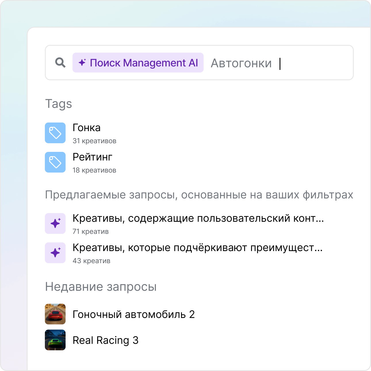 Мгновенно находите креативы с помощью ИИ-поиска – ищите по визуалам, тексту, темам или эффективности. Помечайте тегами и группируйте ресурсы для сравнения концепций, выявления трендов и разработки эффективных стратегий.