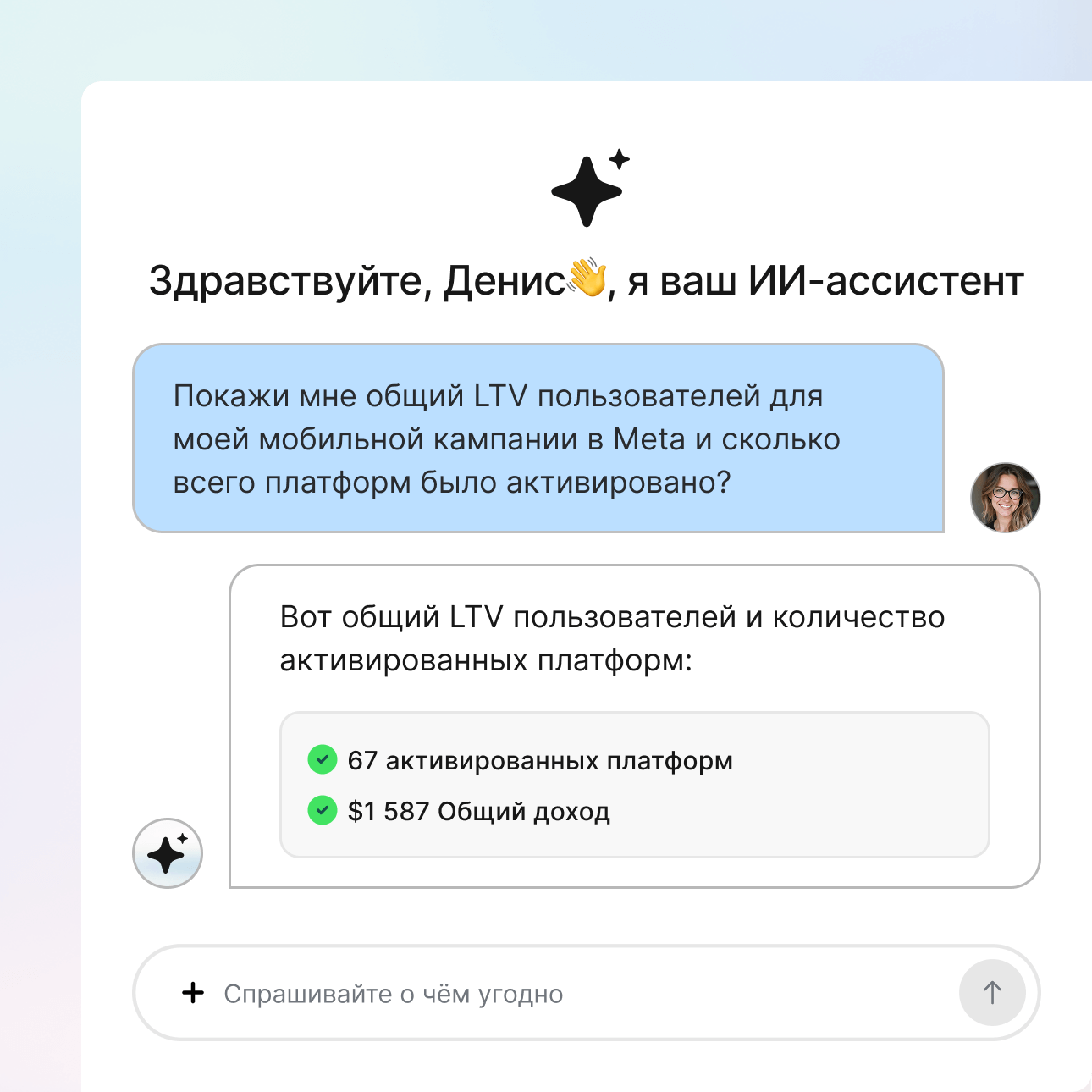 Задавайте вопросы простыми словами и получайте мгновенные ответы. Спросите «Какие кампании привлекают пользователей с LTV $100+?» или «Показать кроссплатформенные пути конверсии», и получите ответ, не дожидаясь помощи от бизнес-аналитиков.