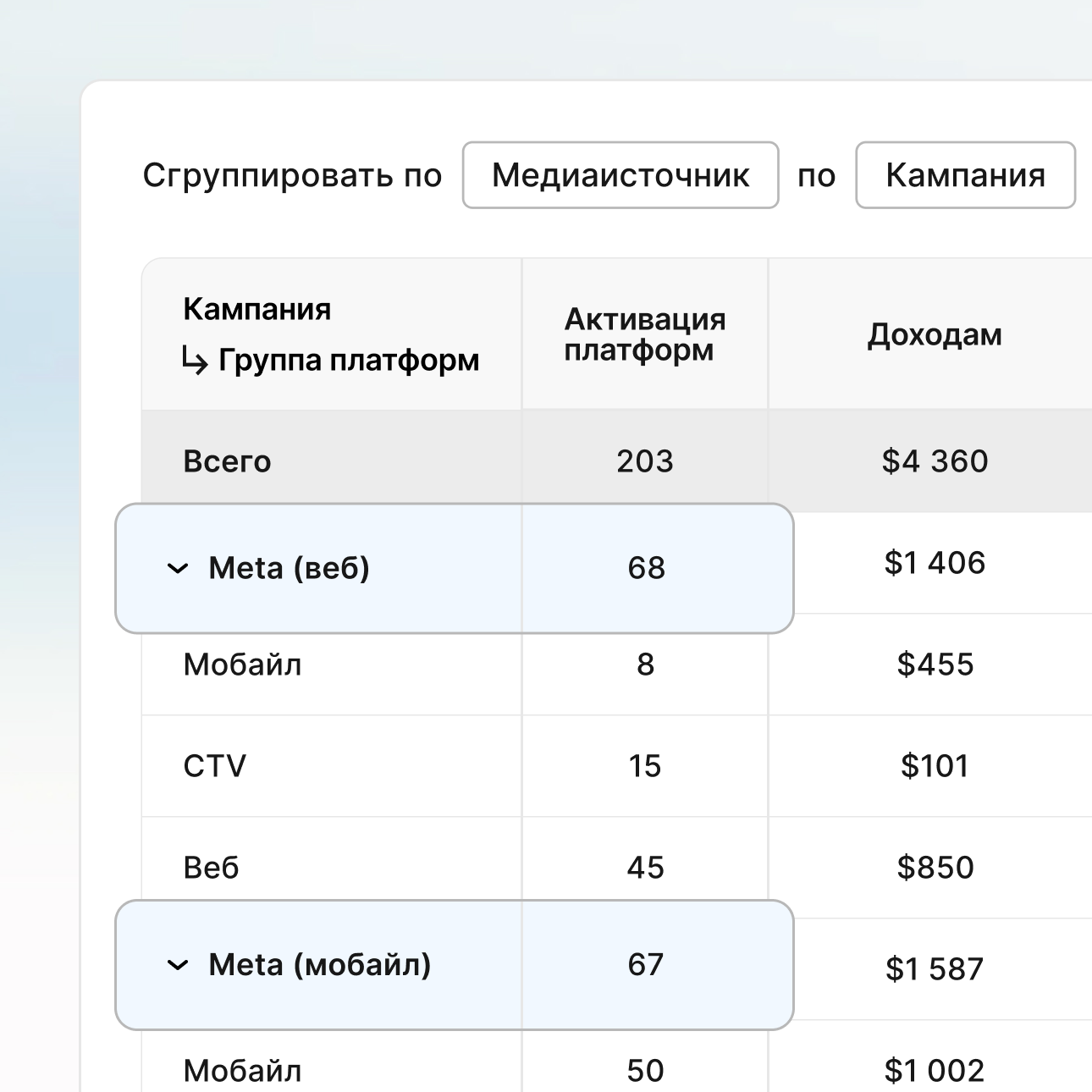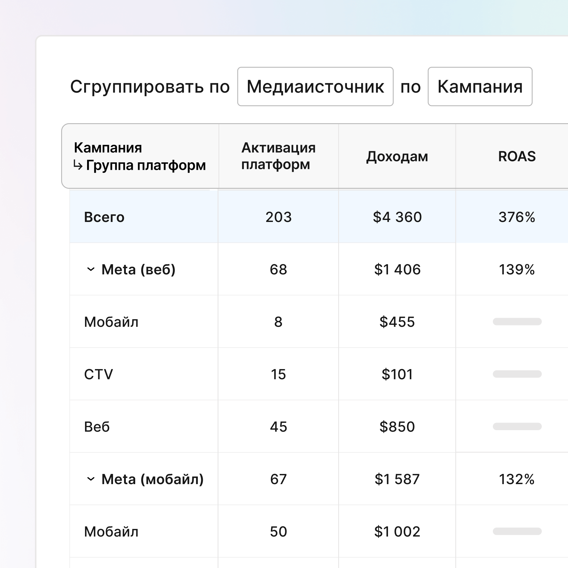 Оценивайте истинную LTV, выходя за рамки метрик, основанных лишь на одном устройстве. Рассчитывайте и атрибутируйте доход с каждой платформы к исходной кампании, чтобы определить, какие из них дадут долгосрочную прибыль.