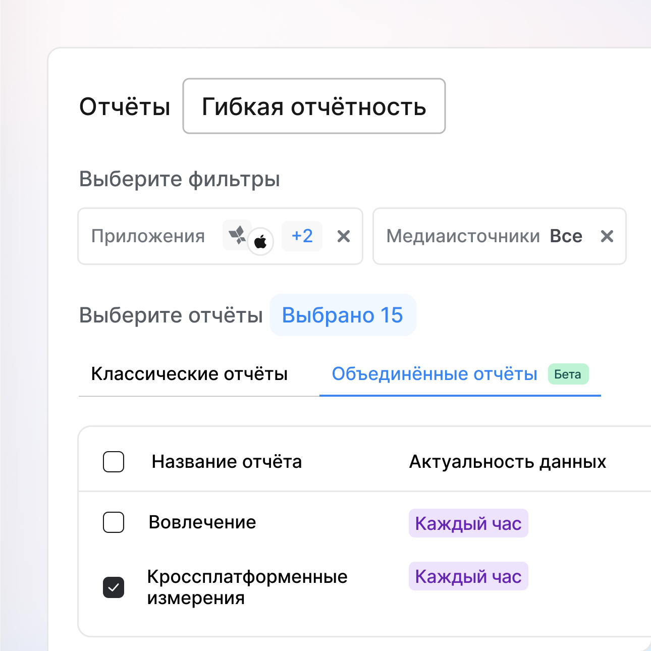 Автоматически объединяйте точки взаимодействия пользователей на мобильных устройствах, в вебе, CTV, ПК и консолях, чтобы видеть полную атрибуцию выручки в одном дэшборде. И все это без привлечения разработчиков.