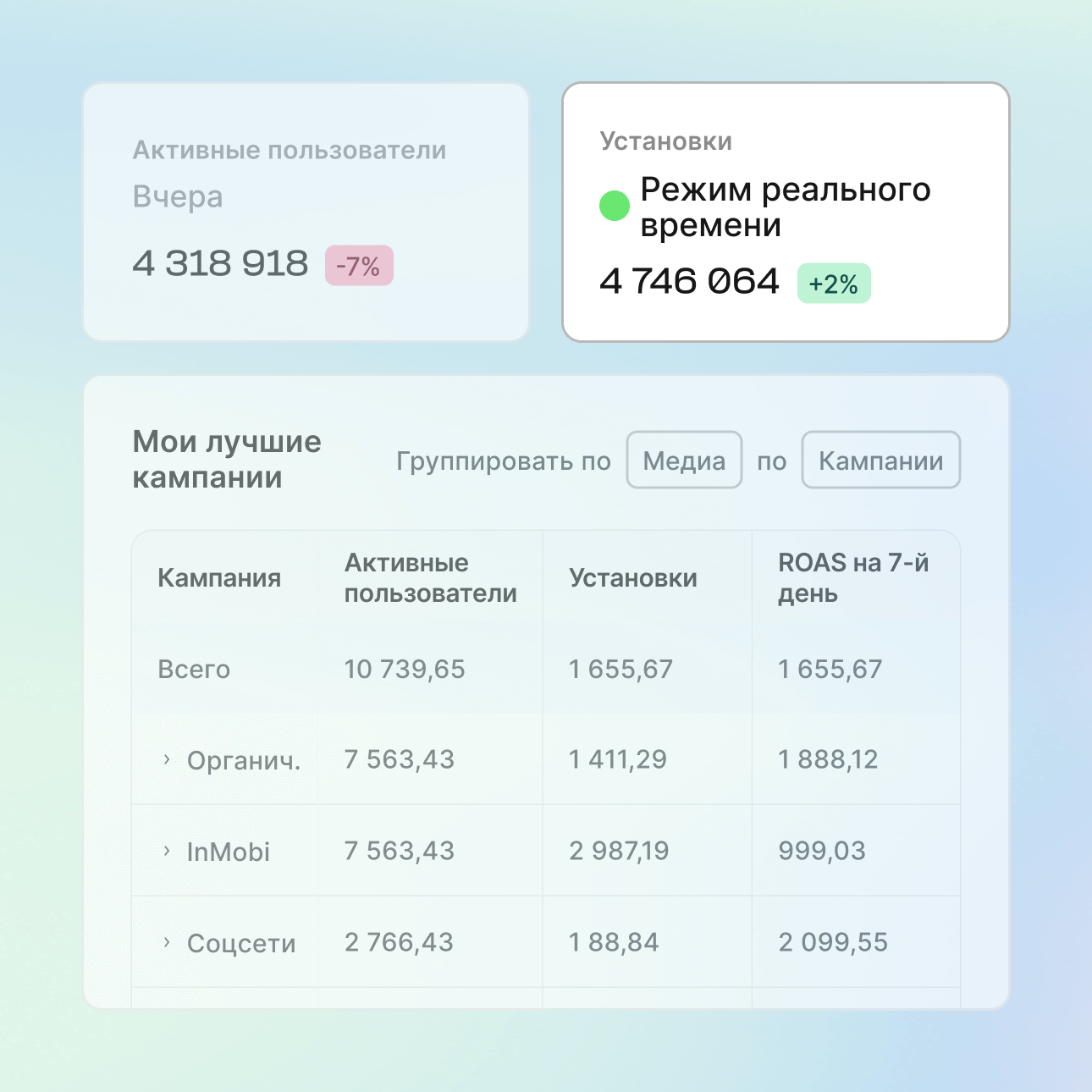 Получите доступ к данным об эффективности кампании уже в процессе её проведения. Мгновенный обзор данных по установкам, событиям и доходам с помощью дэшбордов с обновлением в режиме реального времени позволяет мгновенно оптимизировать кампании.