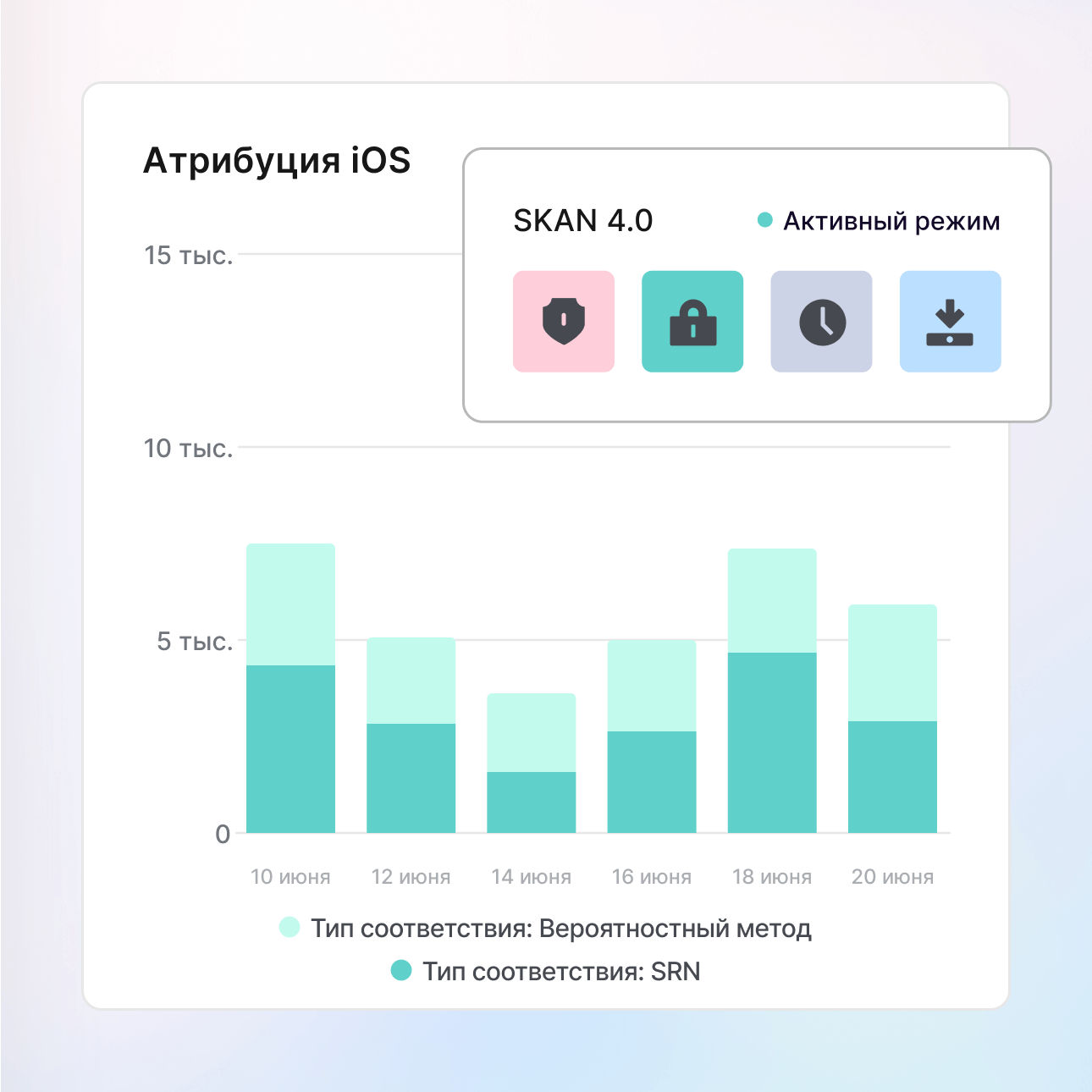 Преодолевайте ограничения iOS с помощью передовых инструментов для моделирования и оптимизации. Получайте нужные вам данные об эффективности кампании с полным соблюдением требований Apple к конфиденциальности.