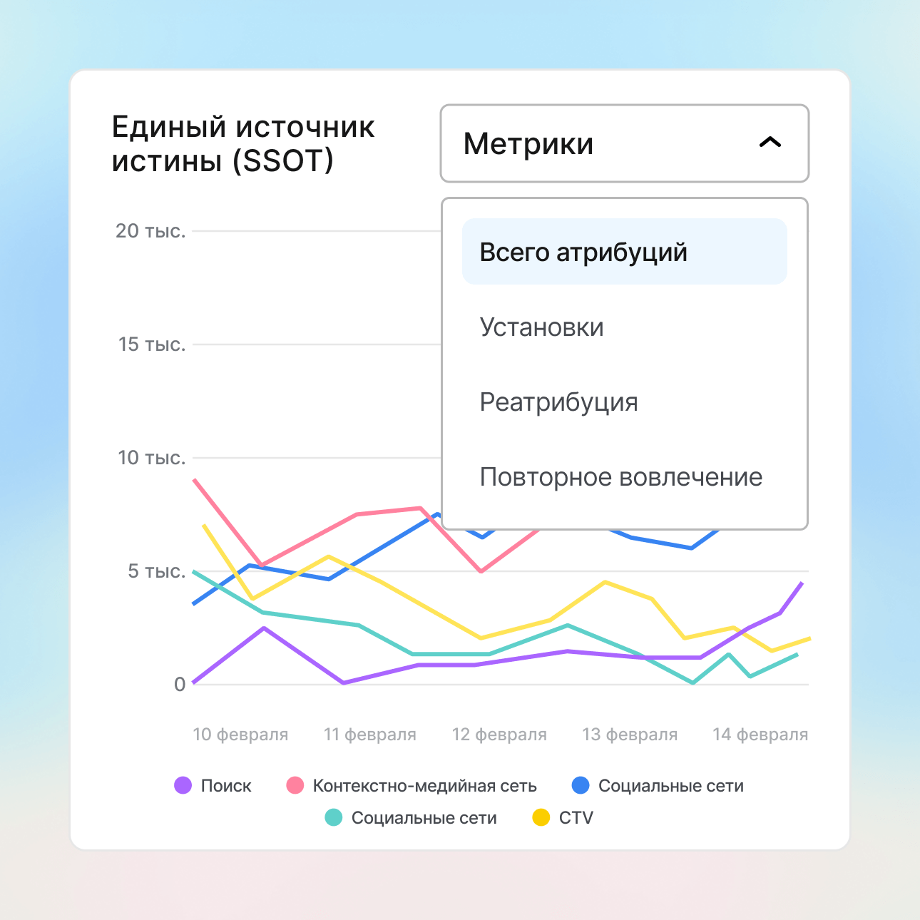 Связывайте разрозненные точки данных в единую, понятную историю. Узнайте, какие каналы действительно обеспечивают рост, находите возможности для оптимизации и повышайте отдачу от каждого доллара, вложенного в маркетинг, благодаря объединенной аналитике.