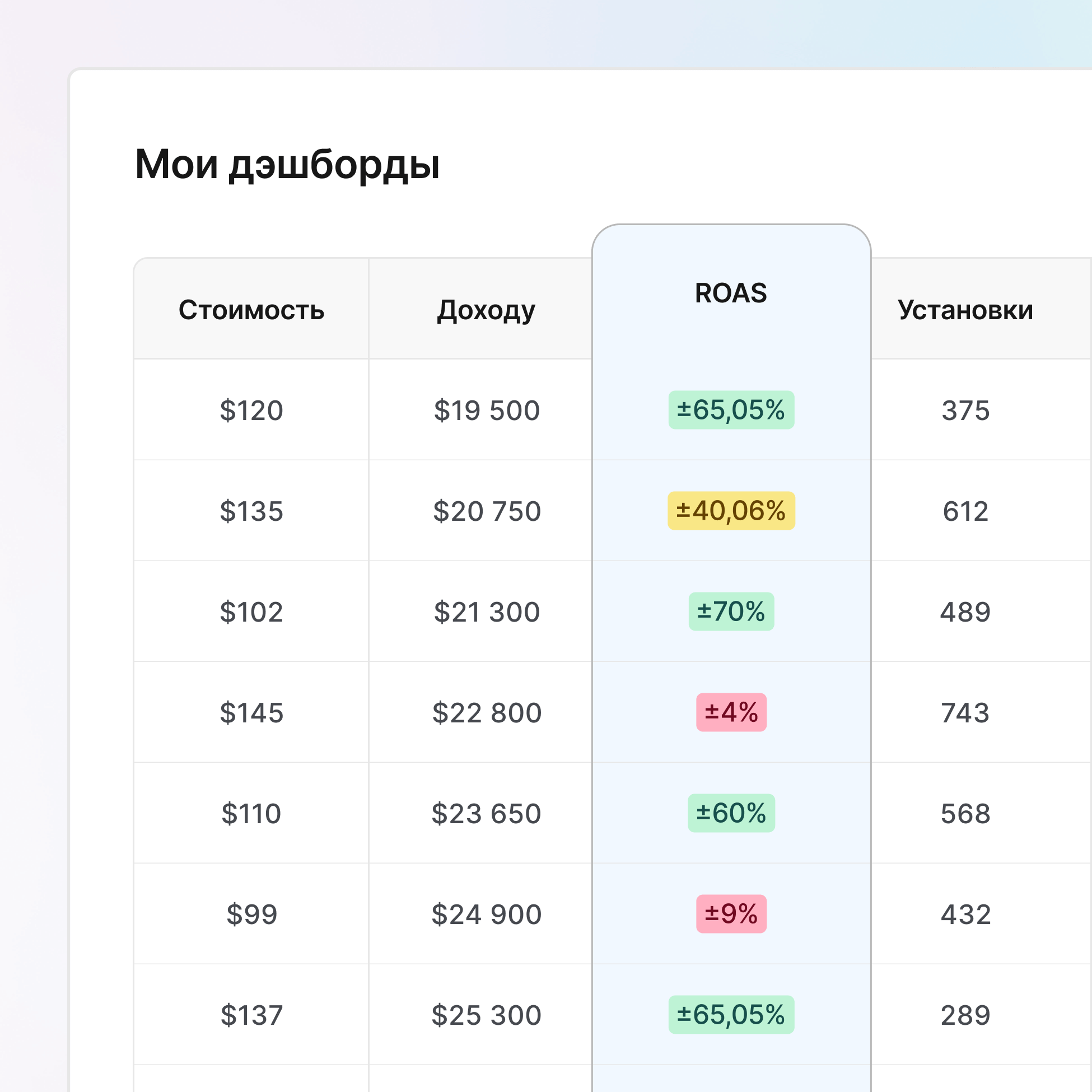 Объединяйте данные о расходах из более 100 источников с данными о выручке со всех платформ. Показывайте руководству, какие кампании действительно приносят прибыль, а не просто установки – на основе дедуплицированных данных, в достоверности которых не возникает сомнений.