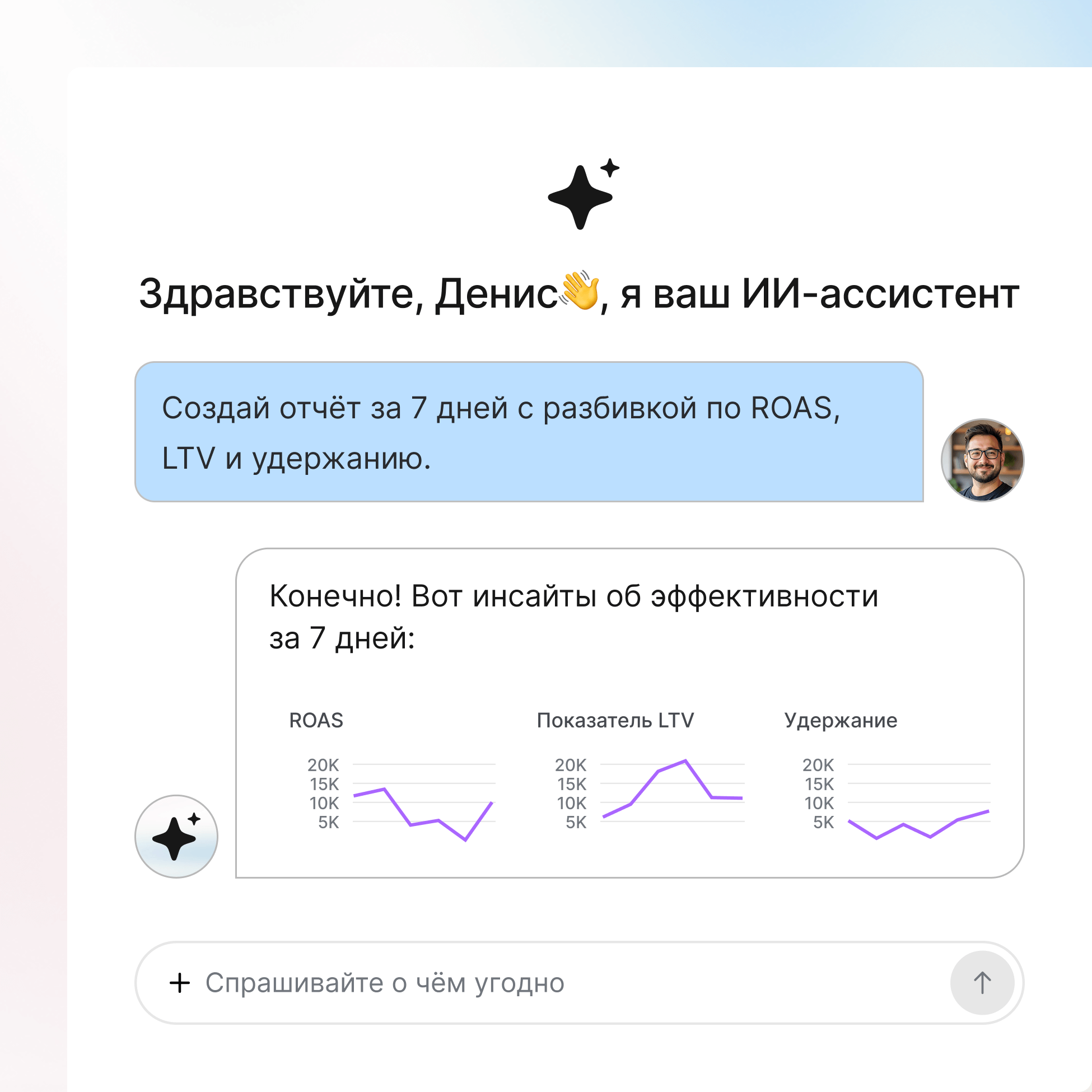 Объединяйте все метрики из всех источников, создавайте дэшборды под свой рабочий процесс и получайте инсайты ИИ, которые связывают креативные решения с бизнес-результатами.